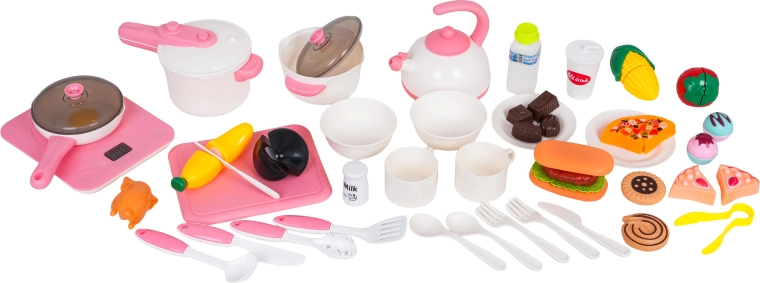 Zestaw jest bogato wyposażony – od naczyń i sztućców, przez patelnię, szybkowar, czajniczek, aż po atrakcyjne produkty na rzep (owoce, warzywa, pizza, desery). Nie brakuje stojaka na wypieki, szafek do przechowywania, haczyków na akcesoria i ociekacza na naczynia. Kuchnia wspiera zabawy w odgrywanie ról, rozwój motoryki małej i umiejętności społecznych.