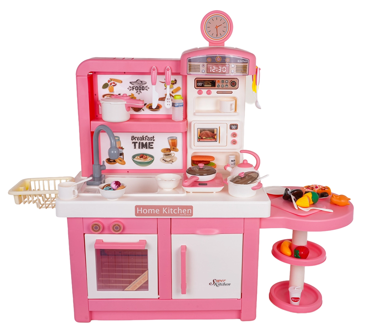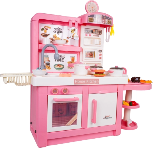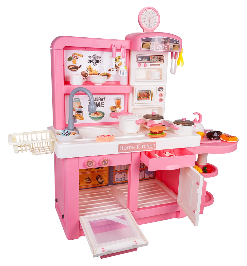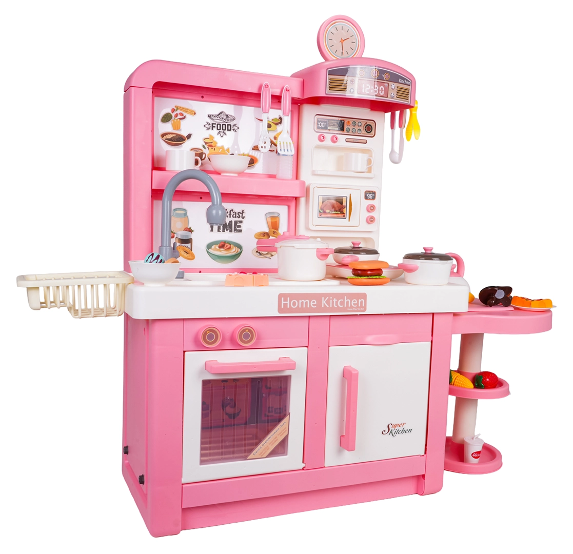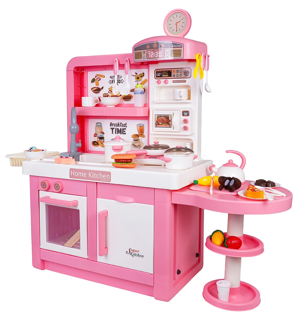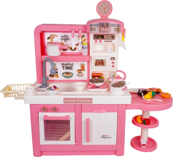 Ta interaktywna kuchnia w różowo-białej kombinacji została zaprojektowana do bezpiecznej i kreatywnej zabawy. Dzieci docenią realistyczne elementy, takie jak mikrofalówka, zlew z kranem, płyta indukcyjna, piekarnik, ekspres do kawy i „lodówka”. Obracane pokrętła wydają dźwięki gotowania i smażenia, podświetlany palnik z wyświetlaczem temperatury potęguje atmosferę, a z jednego garnka unosi się delikatna zimna para.