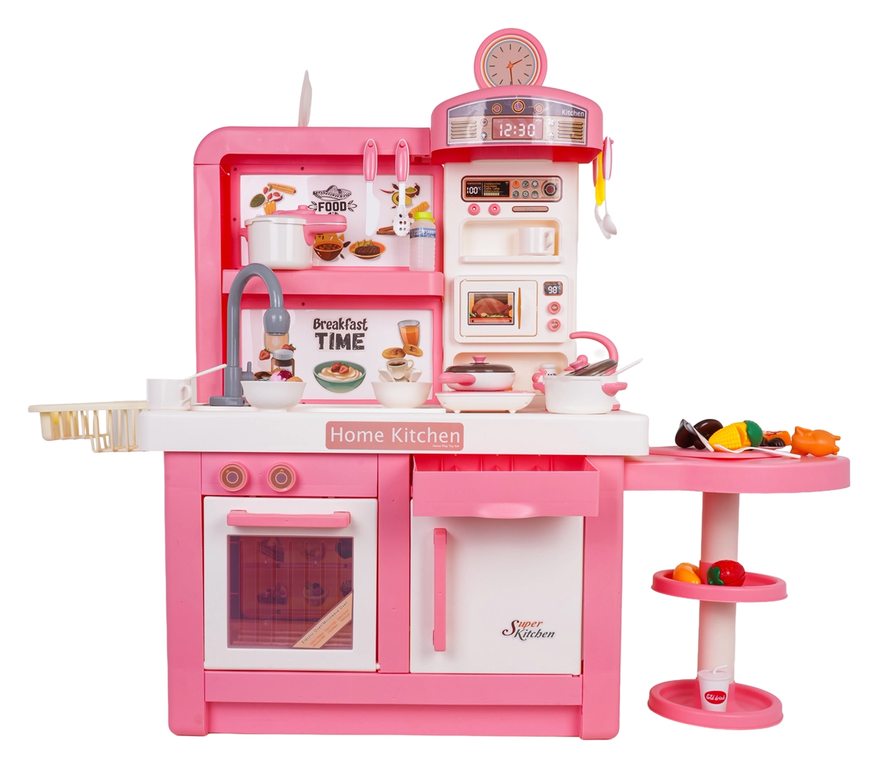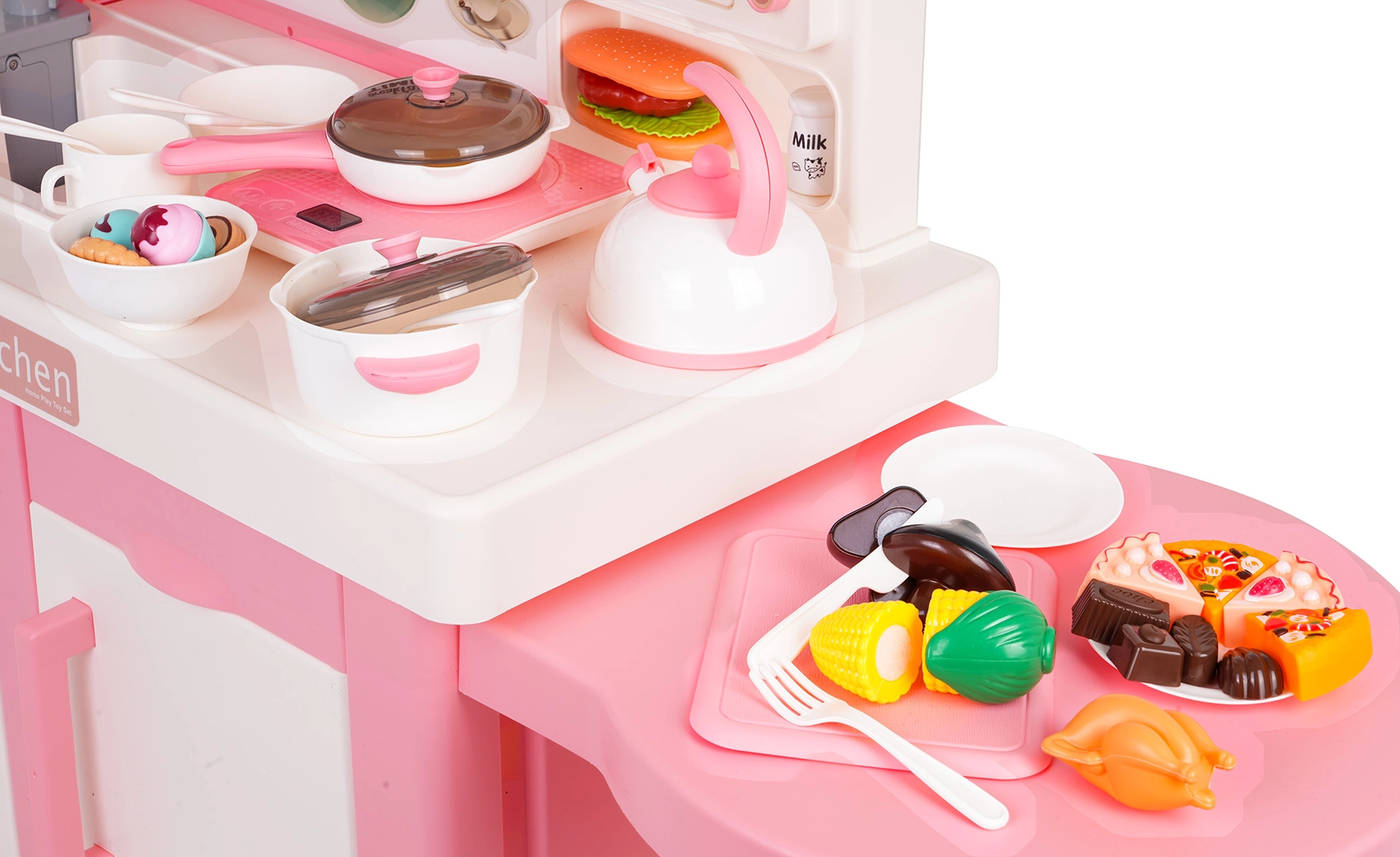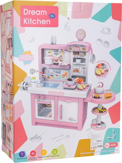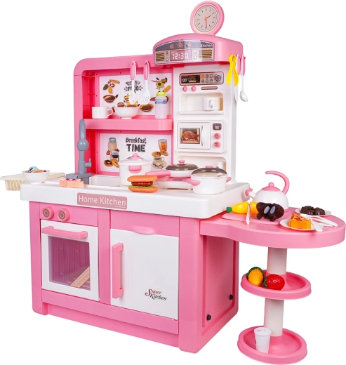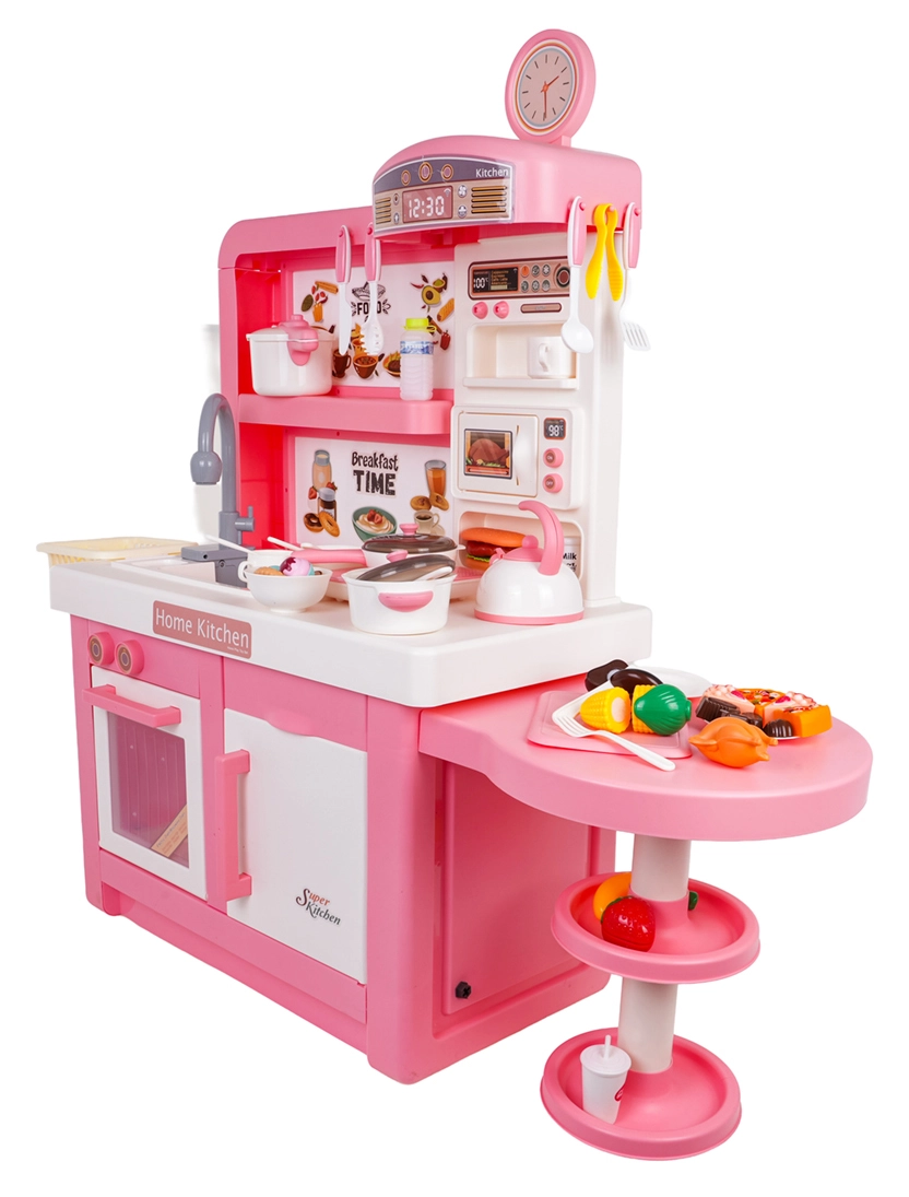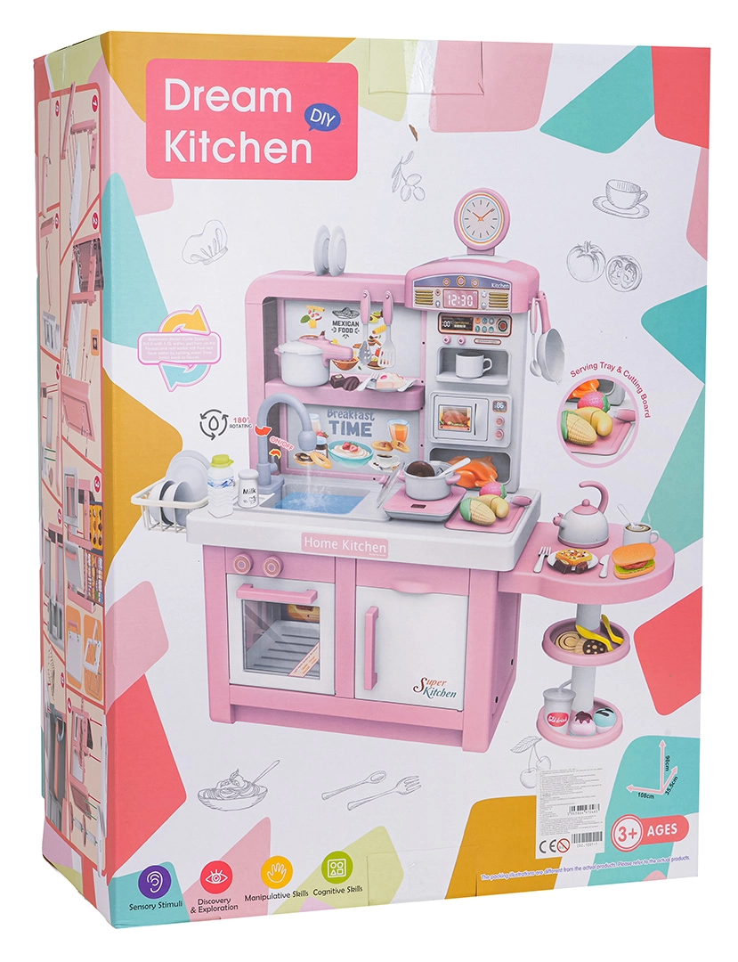 Ta interaktywna kuchnia w różowo-białej kombinacji została zaprojektowana do bezpiecznej i kreatywnej zabawy. Dzieci docenią realistyczne elementy, takie jak mikrofalówka, zlew z kranem, płyta indukcyjna, piekarnik, ekspres do kawy i „lodówka”. Obracane pokrętła wydają dźwięki gotowania i smażenia, podświetlany palnik z wyświetlaczem temperatury potęguje atmosferę, a z jednego garnka unosi się delikatna zimna para.