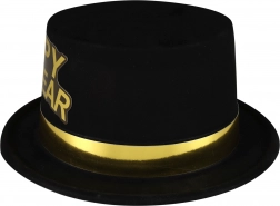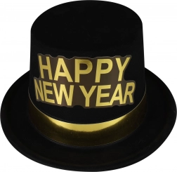 Stylowy czarny kapelusz ze złotym obszyciem i wyraźnym napisem HAPPY NEW YEAR to perfekcyjny dodatek na sylwestrową imprezę i noworoczne obchody. Lekki i wygodny w noszeniu, doda Twojej stylizacji luksusowego, odświętnego charakteru i świetnie sprawdzi się także jako rekwizyt do zdjęć.