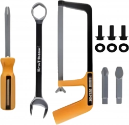 wkrętarka akumulatorowa, pas na narzędzia, okulary, maska, klucz oczkowo-płaski, śrubokręt, 3 śruby, 3 nakrętki, piła, 3 bity
