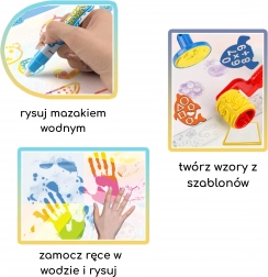 - Bogaty zestaw dodatków – 3 wodne pisaki, 3 stemple, wałek, szablony, autko