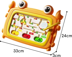 Magnetyczna tablica Montessori w formie wesołego kraba zachwyci dzieci żywym pomarańczowym kolorem i przemyślanym labiryntem. Za pomocą magnetycznego długopisu dzieci przesuwają kolorowe kuleczki, sortują je i podążają trasami z przeszkodami, dzięki czemu wzmacniają cierpliwość, koncentrację oraz prawidłowy chwyt pisaka. Tablica działa całkowicie bez baterii – wszystko napędza siła magnesu.
