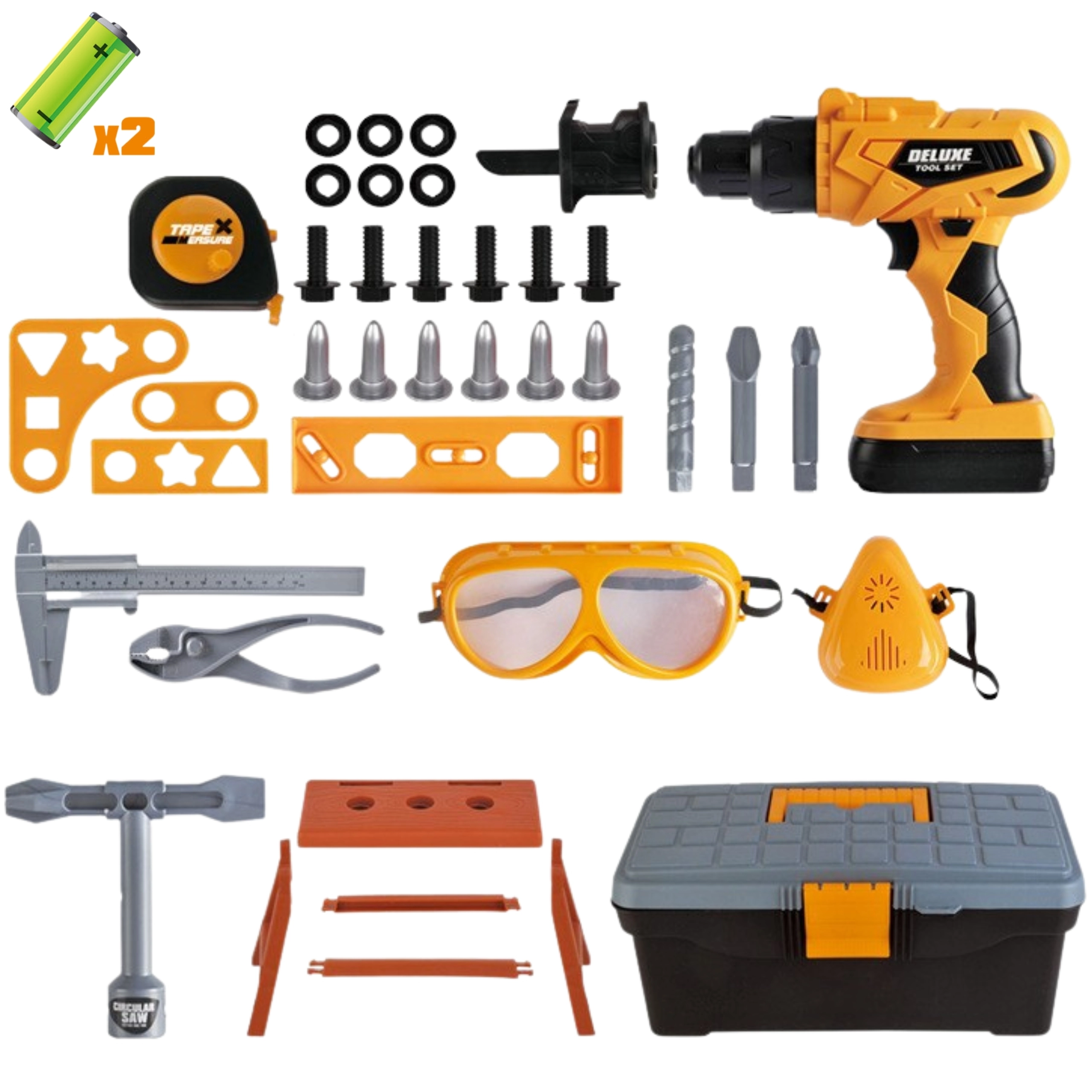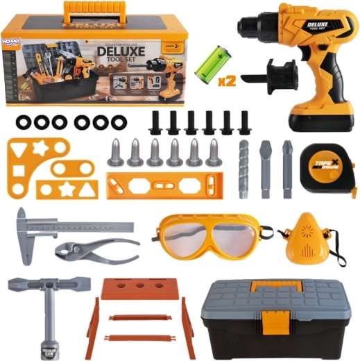 Wszystko mieści się w solidnej walizce/szafce na narzędzia, która ułatwia przenoszenie i organizację. W komplecie znajdują się także gogle ochronne, śruby, nakrętki, bity, wiertło, płytki łączące, mini stolik roboczy oraz inne narzędzia (klucz, miarka, szczypce). Zabawka jest przeznaczona dla dzieci od 3 lat i rozwija zdolności manualne, kreatywność, wyobraźnię oraz koordynację wzrokowo-ruchową.