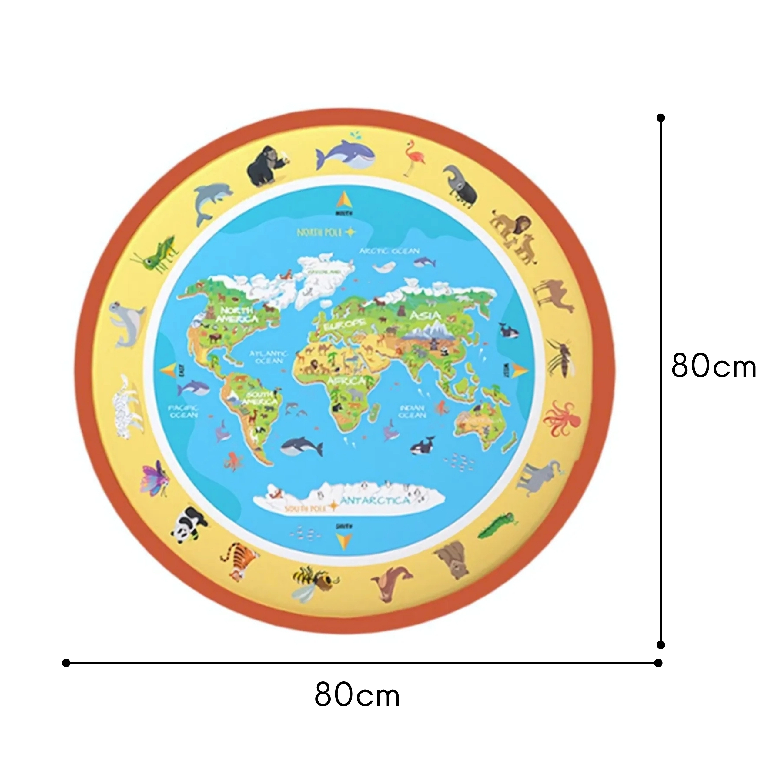 Duża okrągła wodna mata o średnicy 80 cm z motywem mapy świata i zwierząt zamieni podłogę w twórczą pracownię. Dzieci rysują wyłącznie wodą – bez farb, plam i zmartwień, a obrazki po wyschnięciu same znikają. Wspiera motorykę małą, kreatywność oraz wczesne poznawanie świata.