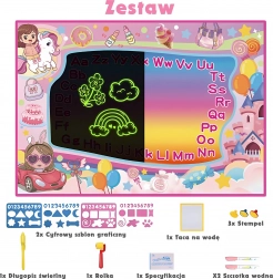 Zawartość opakowania: mata 2w1 (ok. 100 × 70 cm), długopis UV, 2× pisak wodny, 2× szablon, wałek, 3× stempel i chłonny ściereczka.