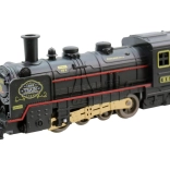 Czarna lokomotywa z czerwonymi i złotymi elementami, kominem i wyrazistymi kołami nadaje każdej jeździe atmosferę prawdziwej kolei.