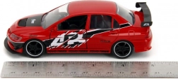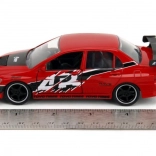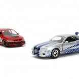 Ten premiumowy zestaw zawiera ikoniczne filmowe auta w świetnym wykonaniu: czerwonego Lancera Evo IX z wyścigową grafiką i wyrazistym skrzydłem oraz srebrnego Skyline’a GT‑R R34 z niebieskimi pasami. Metalowa karoseria, realistyczne detale i funkcjonalne drzwi potęgują wrażenia kolekcjonerskie i podczas zabawy.