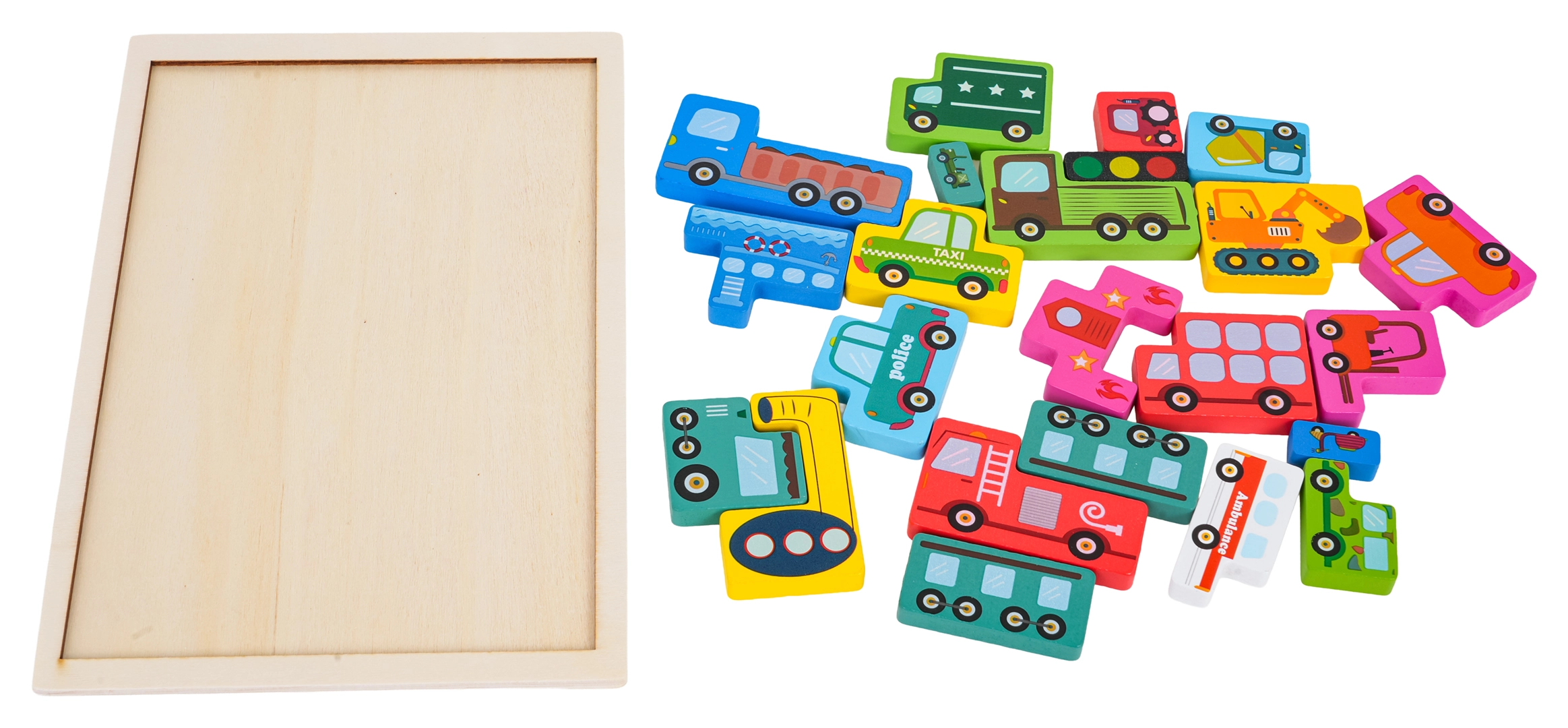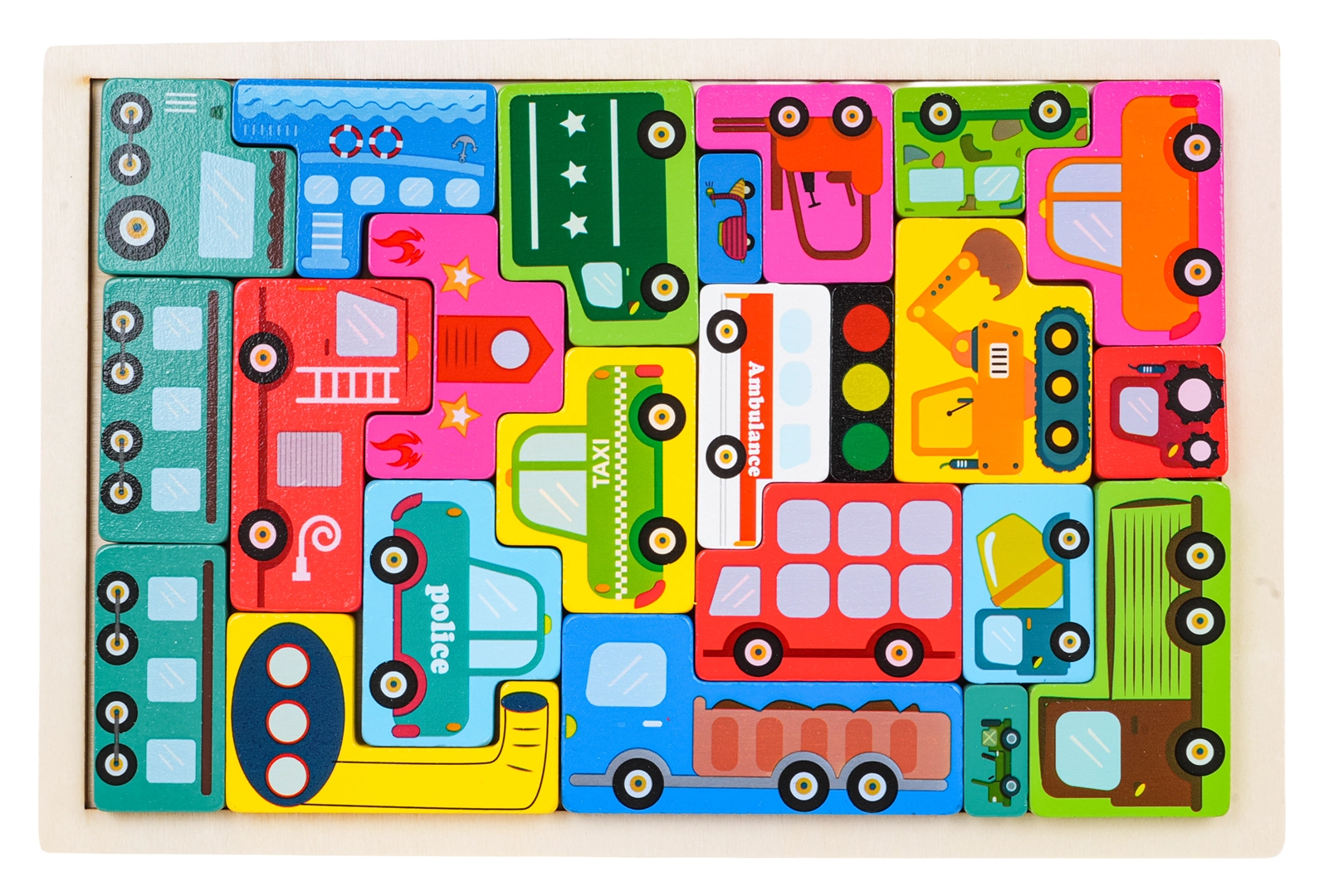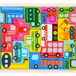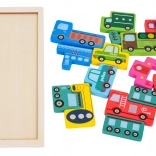 Drewniany zestaw puzzli o tematyce pojazdów oferuje 23 elementy z ilustracjami, takimi jak policja, wóz strażacki, autobus, karetka, taksówka, betoniarka, ładowarka, wózek widłowy i inne. Zadaniem dziecka jest dopasowywanie kształtów i układanie elementów na płycie bazowej, co rozwija małą motorykę, wyobraźnię i logiczne myślenie.
