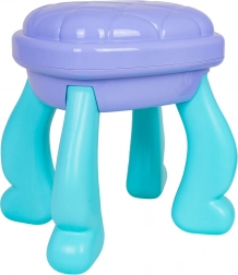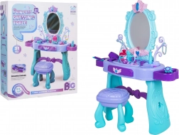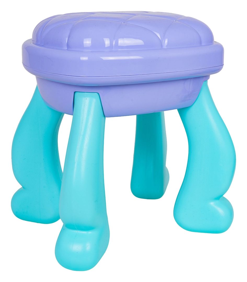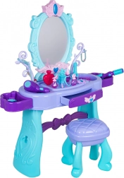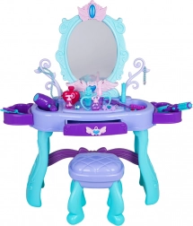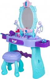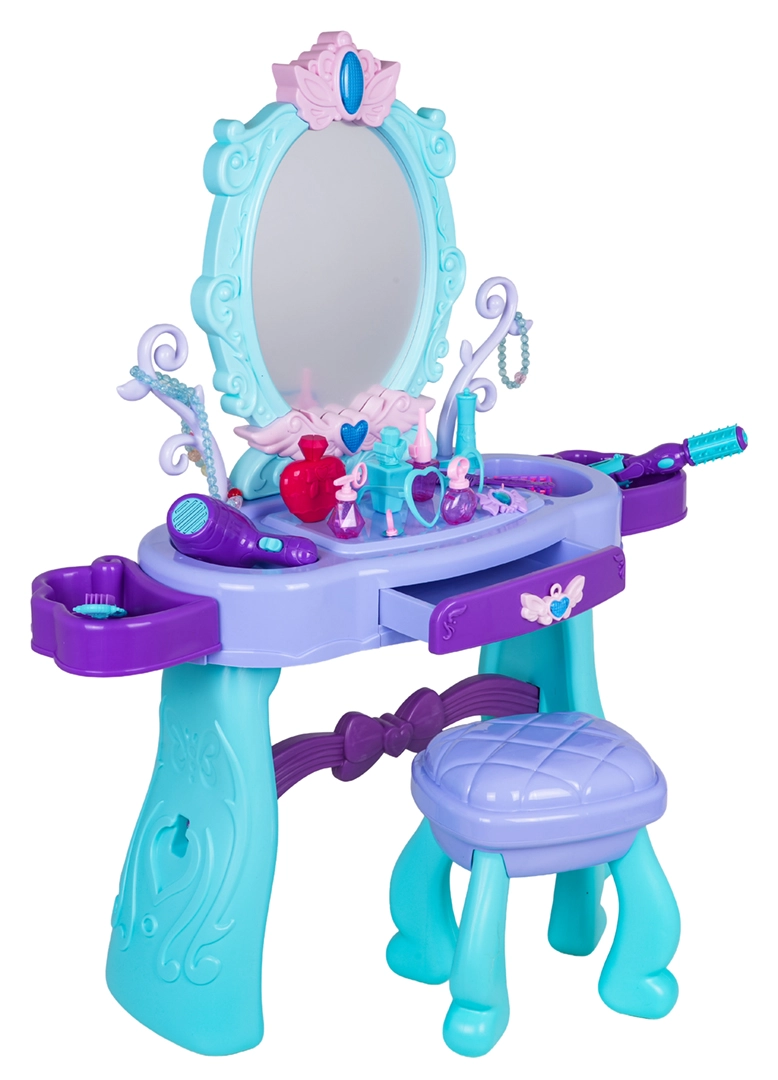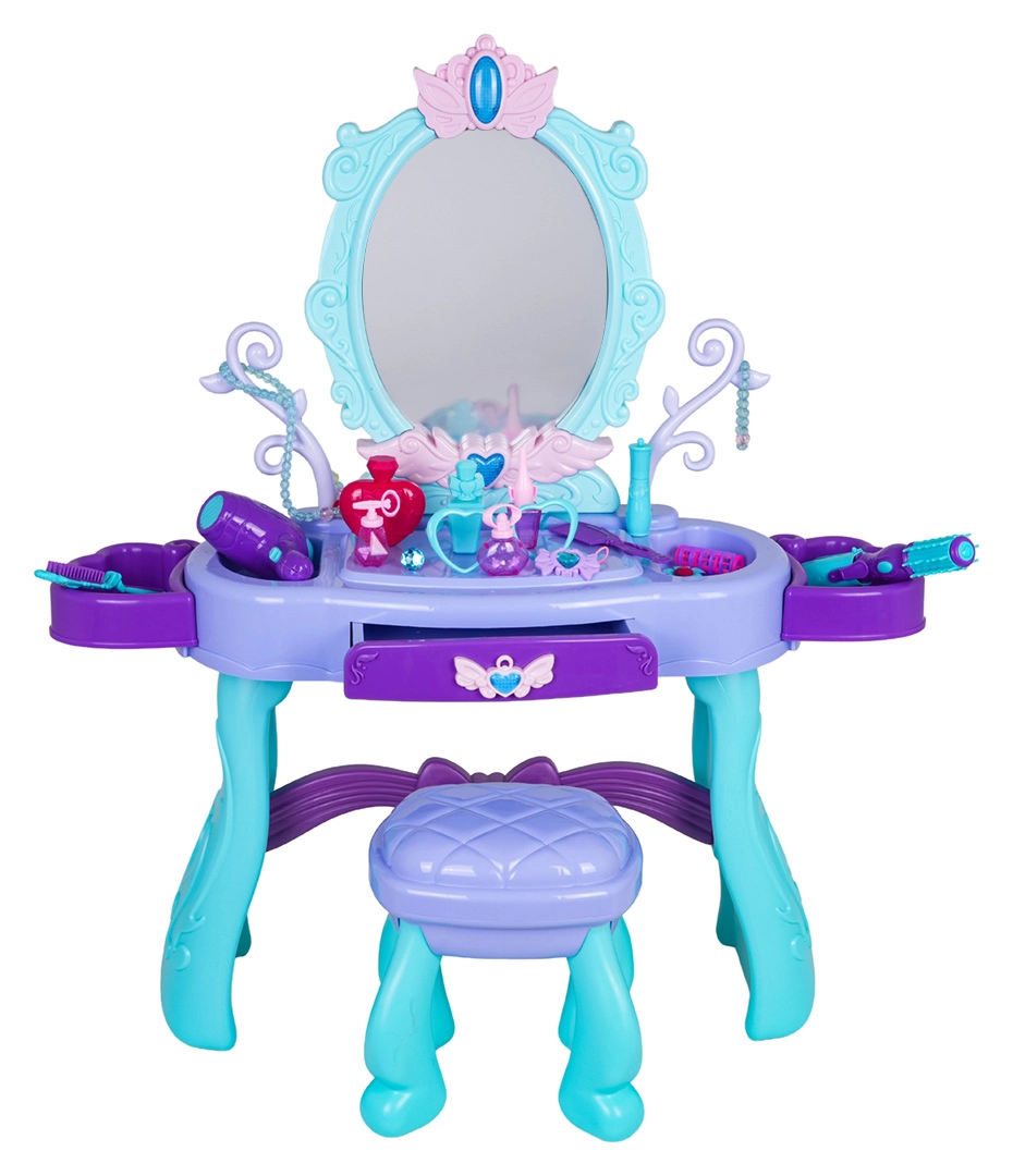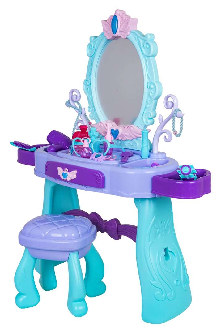 Podaruj dzieciom ich własny magiczny kącik kosmetyczny. Ta toaletka w turkusowo-fioletowej kolorystyce oferuje duże owalne lustro z podświetleniem, praktyczną szufladkę oraz boczne półki odkładcze na wszystkie akcesoria. Stabilny stołeczek zapewnia wygodne siedzenie i bezpieczną zabawę.