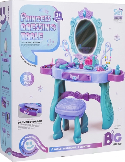 Stylowa dziecięca toaletka z dużym lustrem, podświetleniem i bogatym zestawem akcesoriów do kreatywnej zabawy. Zawiera stołeczek, szufladkę oraz boczne półeczki na akcesoria. W zestawie znajdziesz suszarę, lokówkę z prostownicą, szczotki, okulary, biżuterię i dodatki do makijażu. Do światła lustra wystarczą 2× baterie AA (brak w zestawie). Idealny prezent dla małych księżniczek od 3 lat.