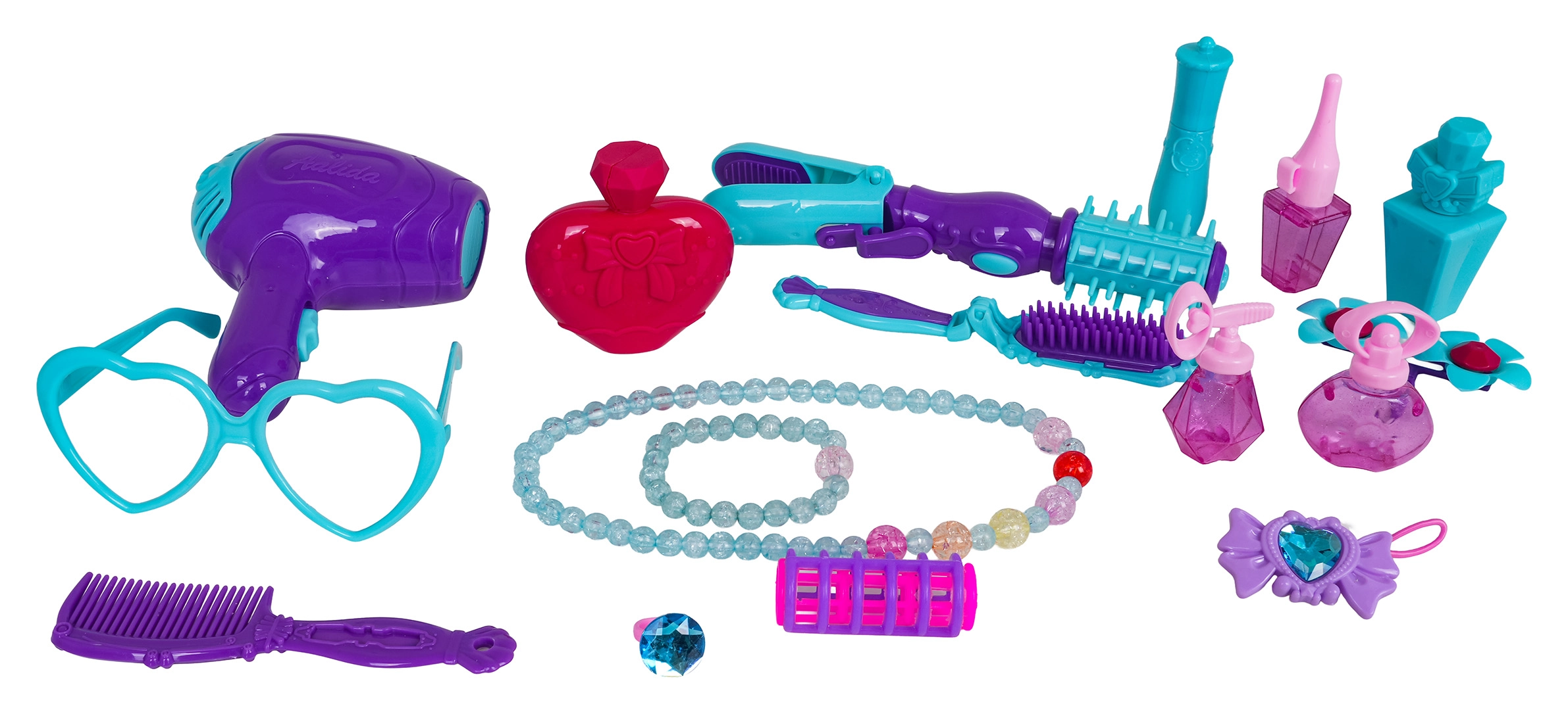 W komplecie: suszarka, lokówka z prostownicą, składana szczotka, grzebień, okulary, flakoniki, „szminka” i „lakier”, korale, bransoletka, pierścionek, spinki, gumka i inne drobiazgi.