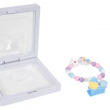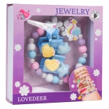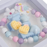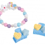 Ten urokliwy zestaw dla dzieci łączy figlarny motyw jednorożca z delikatnymi kolorami i przyjemnymi materiałami. Bransoletka jest wykonana z różnokolorowych drewnianych koralików i perełek, uzupełnionych uroczą zawieszką jednorożca. Dwie praktyczne spinki dopełnią każdą fryzurę i pobudzą wyobraźnię podczas zabawy.