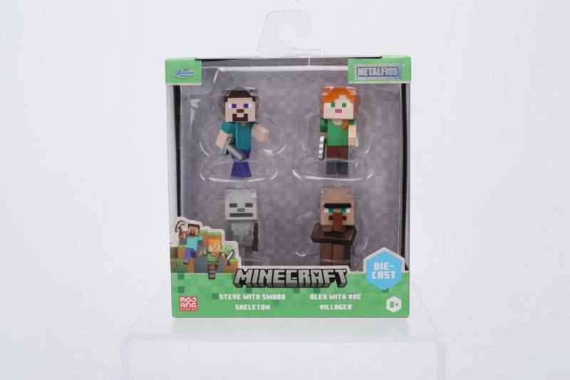 W opakowaniu znajdziesz cztery ulubione postacie: Steve z mieczem, Alex z siekierą, Szkielet i Mieszkaniec (Villager). Dzięki kompaktowej wysokości 6 cm figurki świetnie sprawdzą się na biurku, półce lub w gablocie.