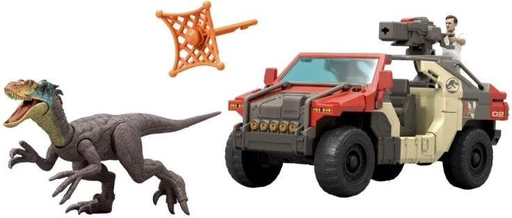 - Figurki w zestawie: welociraptor (ok. 19 cm) oraz kierowca Martin Krebs (ok. 9,5 cm).