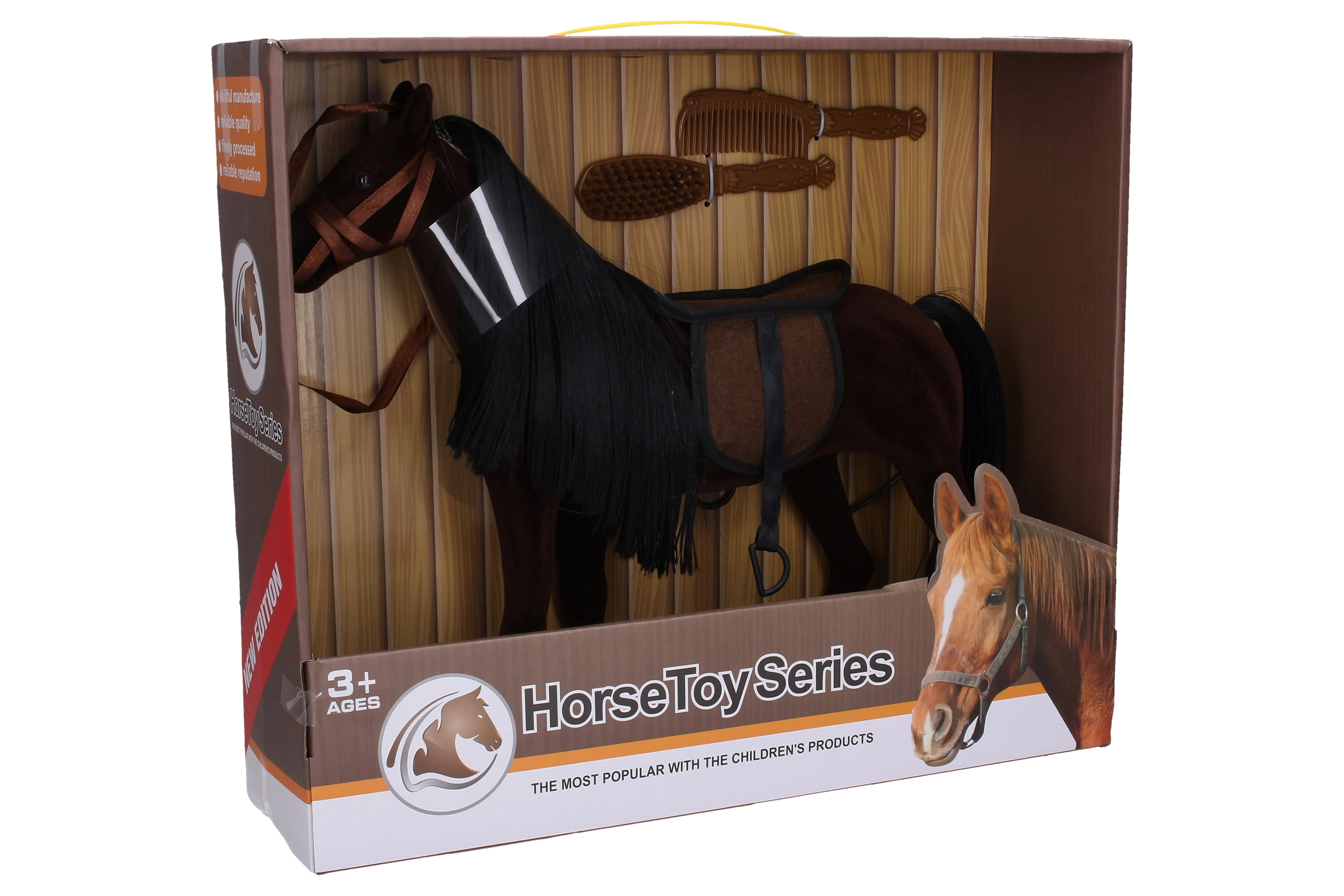 Uroczy pluszowy koń w ciemnym kolorze o wysokości 35 cm ucieszy każdego małego miłośnika koni. W zestawie znajdują się siodło i dwa grzebienie do łatwego czesania i pielęgnacji. Idealna zabawka do rozwijania wyobraźni i małej motoryki. Miękki materiał, realistyczne detale i praktyczne akcesoria zapewnią mnóstwo zabawy w domu i w podróży.