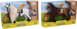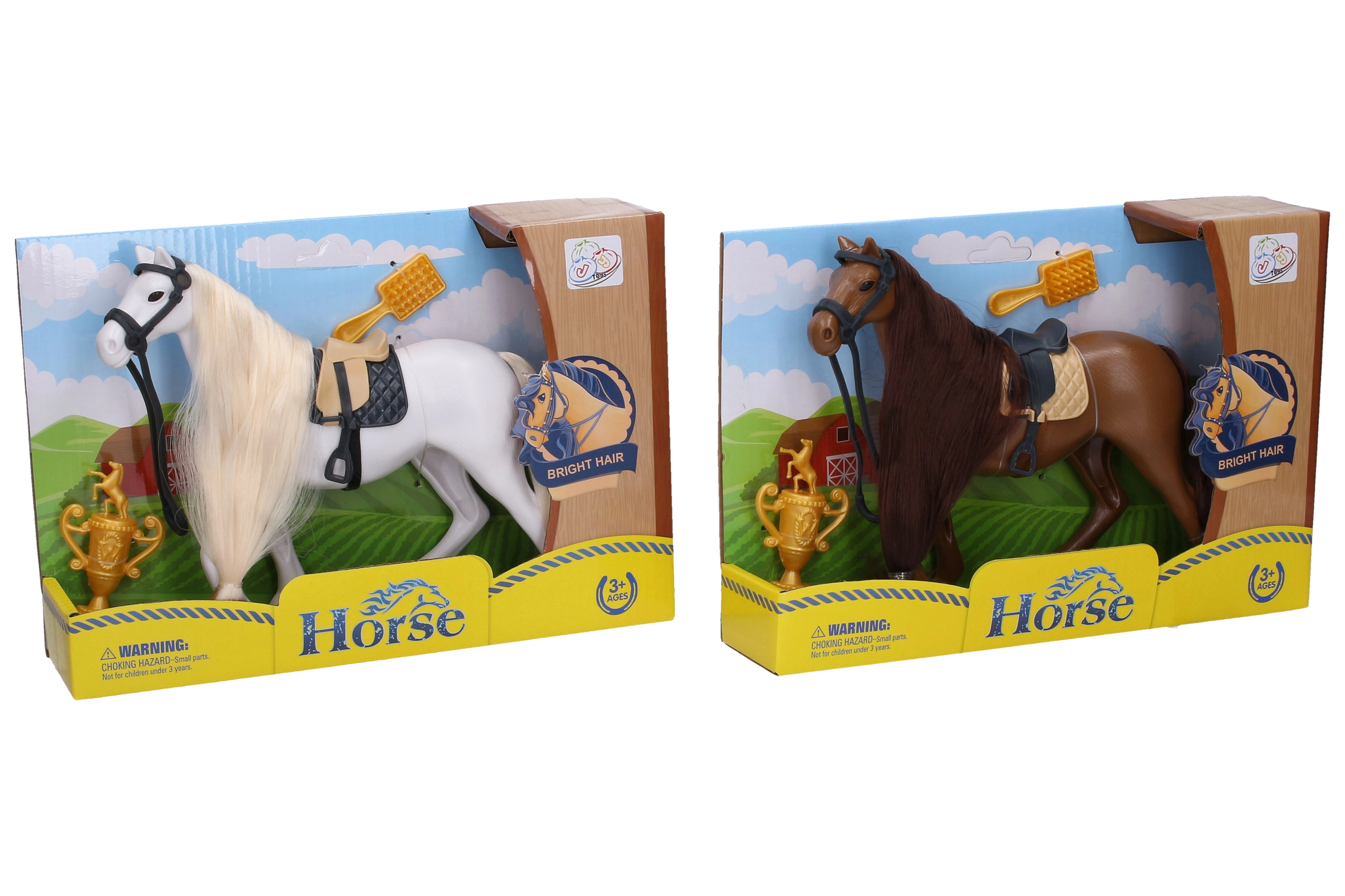 Realistyczny koń o wysokości 19 cm w dwóch kolorach (brązowym i białym) ucieszy każdego małego miłośnika koni. W zestawie znajdują się koń z siodłem i uzdą, trofeum oraz szczotka do pielęgnacji grzywy – idealne do zabawy w klub jeździecki i rozwijania wyobraźni.