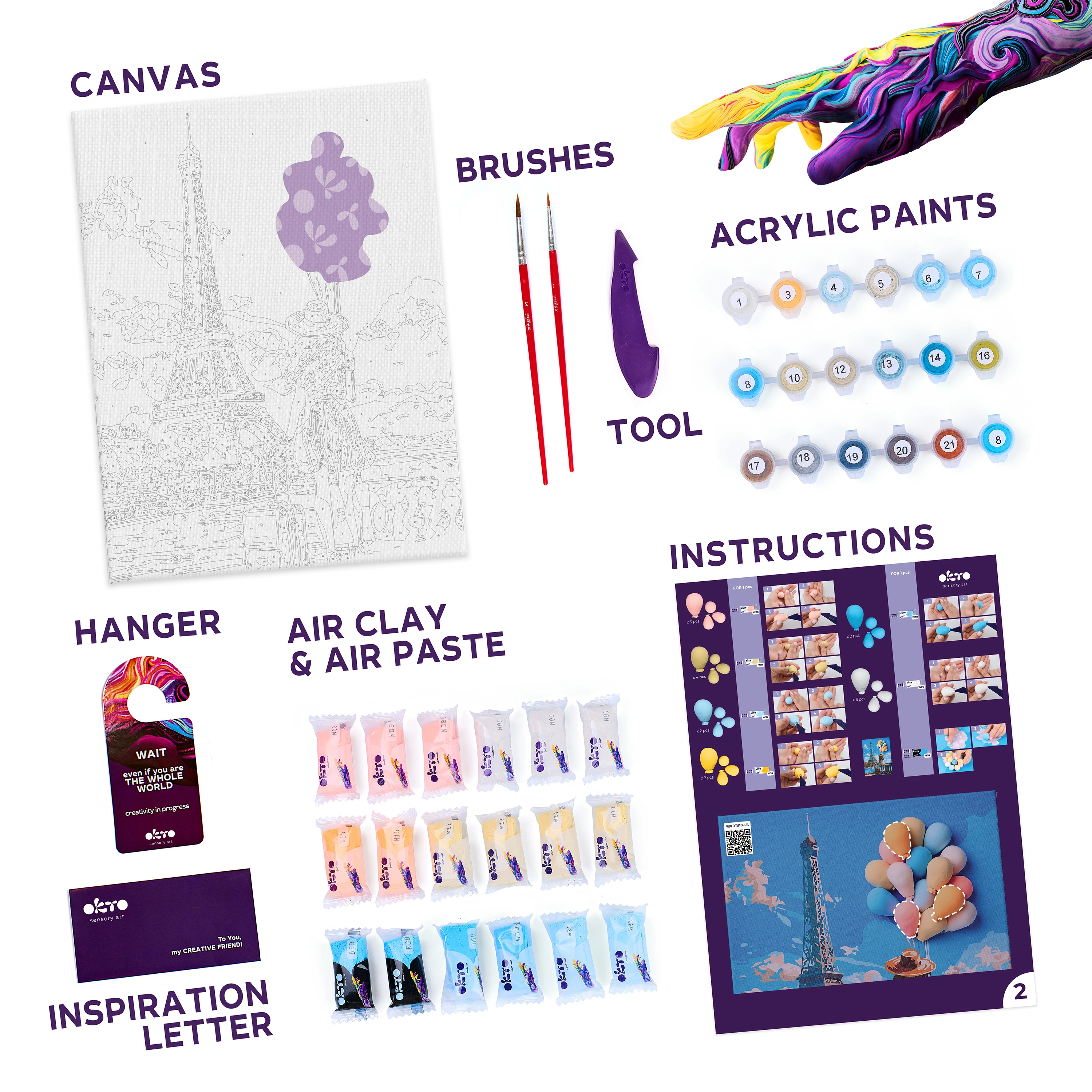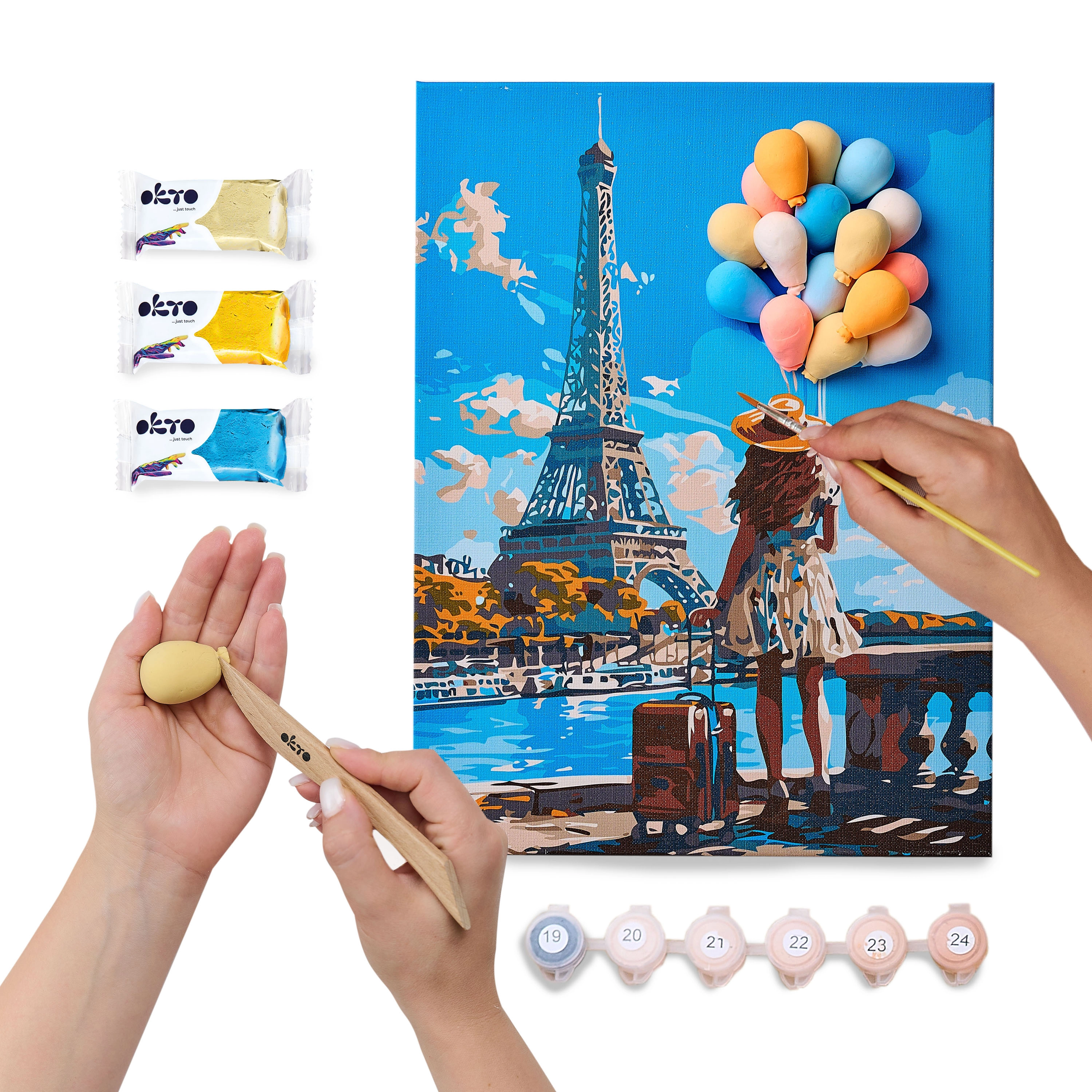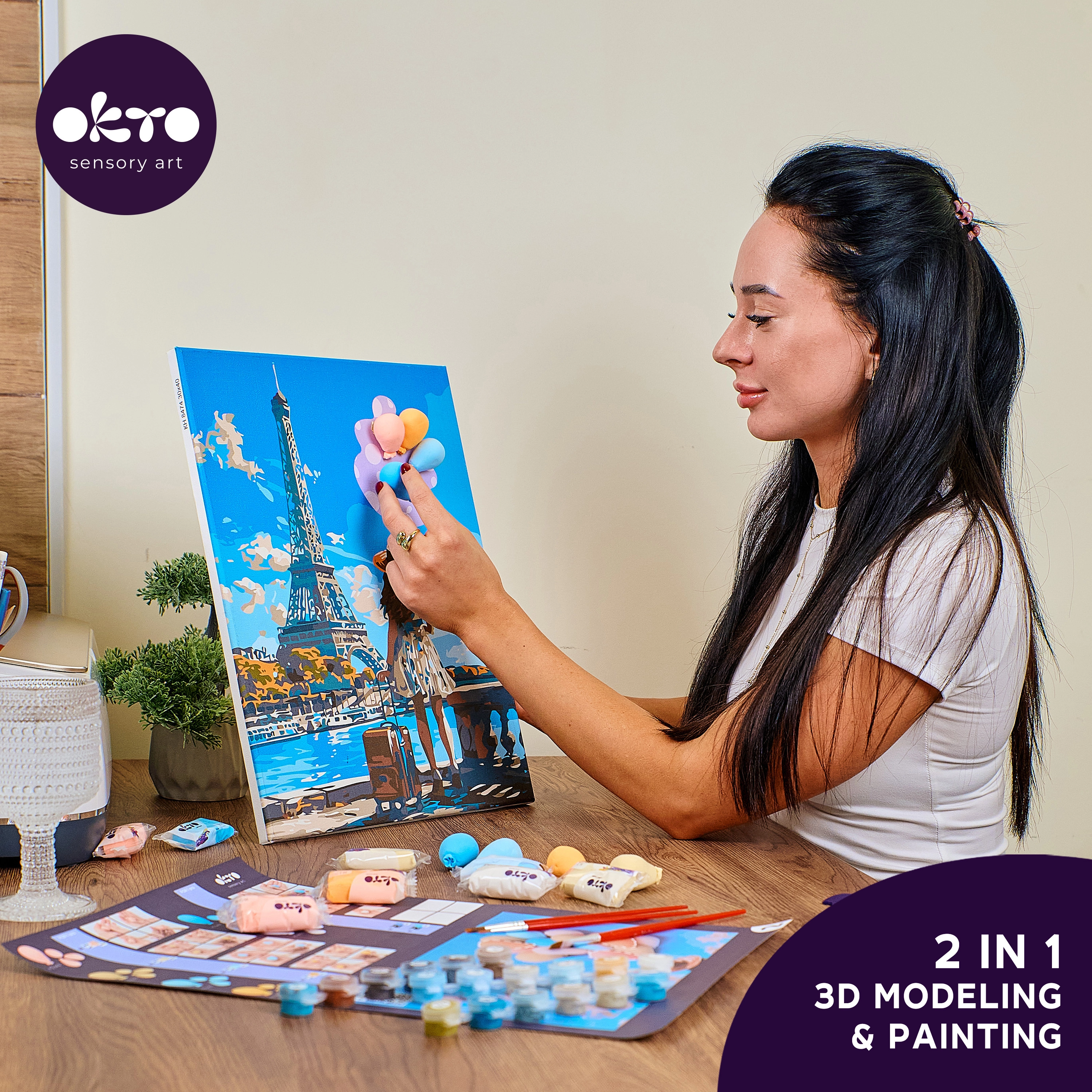 Ten kreatywny zestaw OKTO łączy malarstwo z modelowaniem 3D, dzięki czemu w domu stworzysz wyjątkowy obraz z motywem Paryża. Dzięki szablonowi i instrukcji krok po kroku uzyskasz plastyczne elementy, które nadadzą obrazowi głębi i stylu. Idealny jako prezent oraz dekoracja wnętrza.