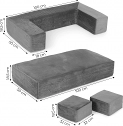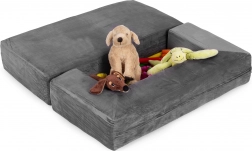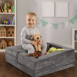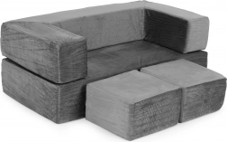 Miękki, sprężysty rdzeń dopasowuje się do ciała podczas siedzenia i leżenia, zapewniając wygodę do zabawy, czytania i odpoczynku. Zdejmowane pokrowce na zamek ułatwiają pielęgnację i pozwalają utrzymać sofę długotrwale świeżą oraz higieniczną. Ponadczasowy szary kolor łatwo łączy się z pozostałym wyposażeniem wnętrza.