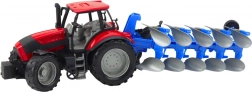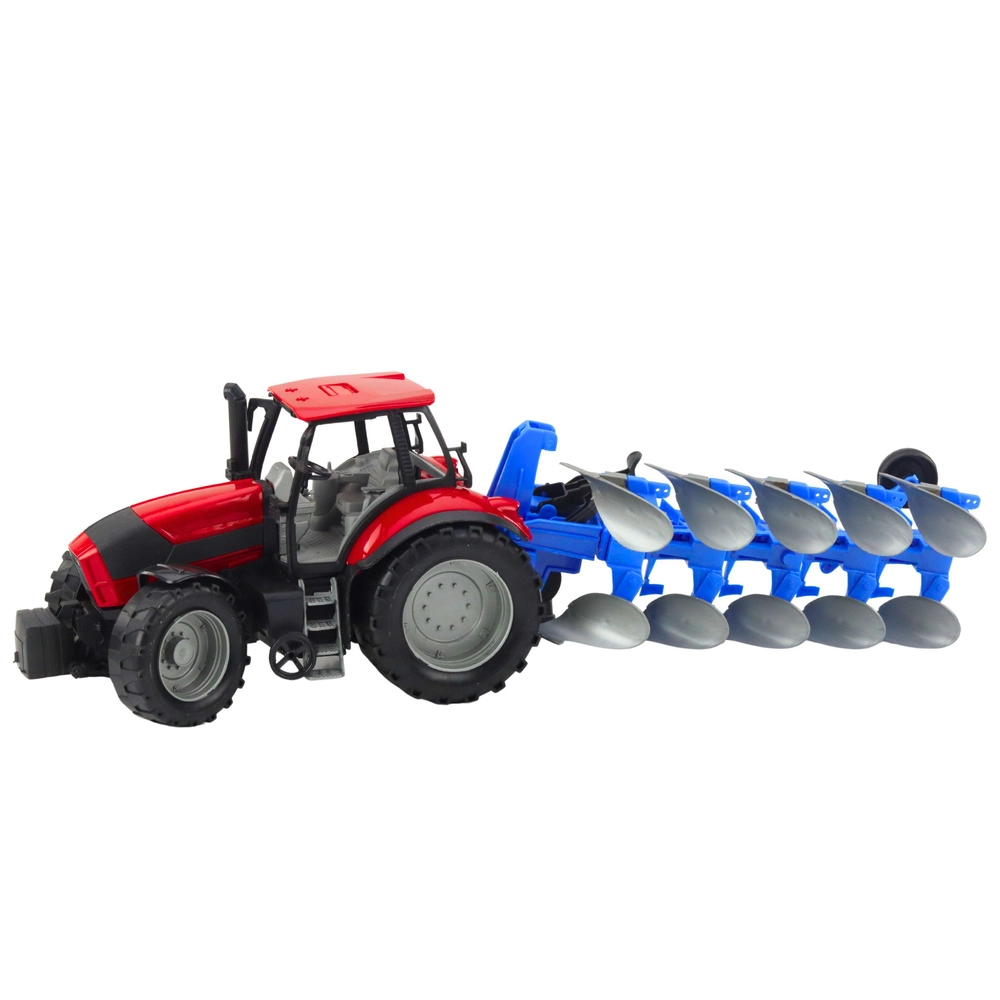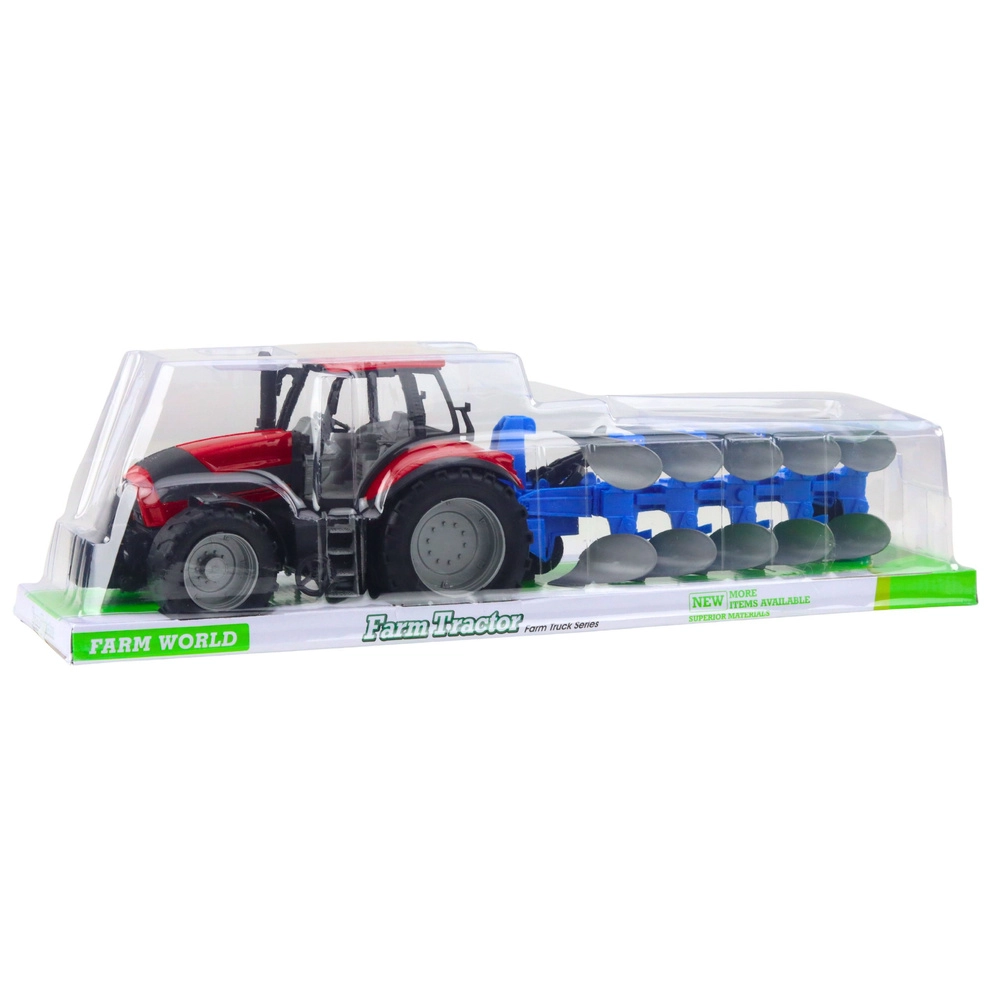 Realistyczny traktor z pługiem dla małych farmerów oferuje duże wymiary 50 cm, napęd na tylne koła oraz detalne wykonanie. Solidny czerwony traktor z niebieskim wieloskibowym pługiem wspiera kreatywną zabawę i rozwija wiedzę o pracy na farmie. Świetny jako zabawka i zestaw edukacyjny, dostarczany w opakowaniu prezentowym z przezroczystym frontem.
