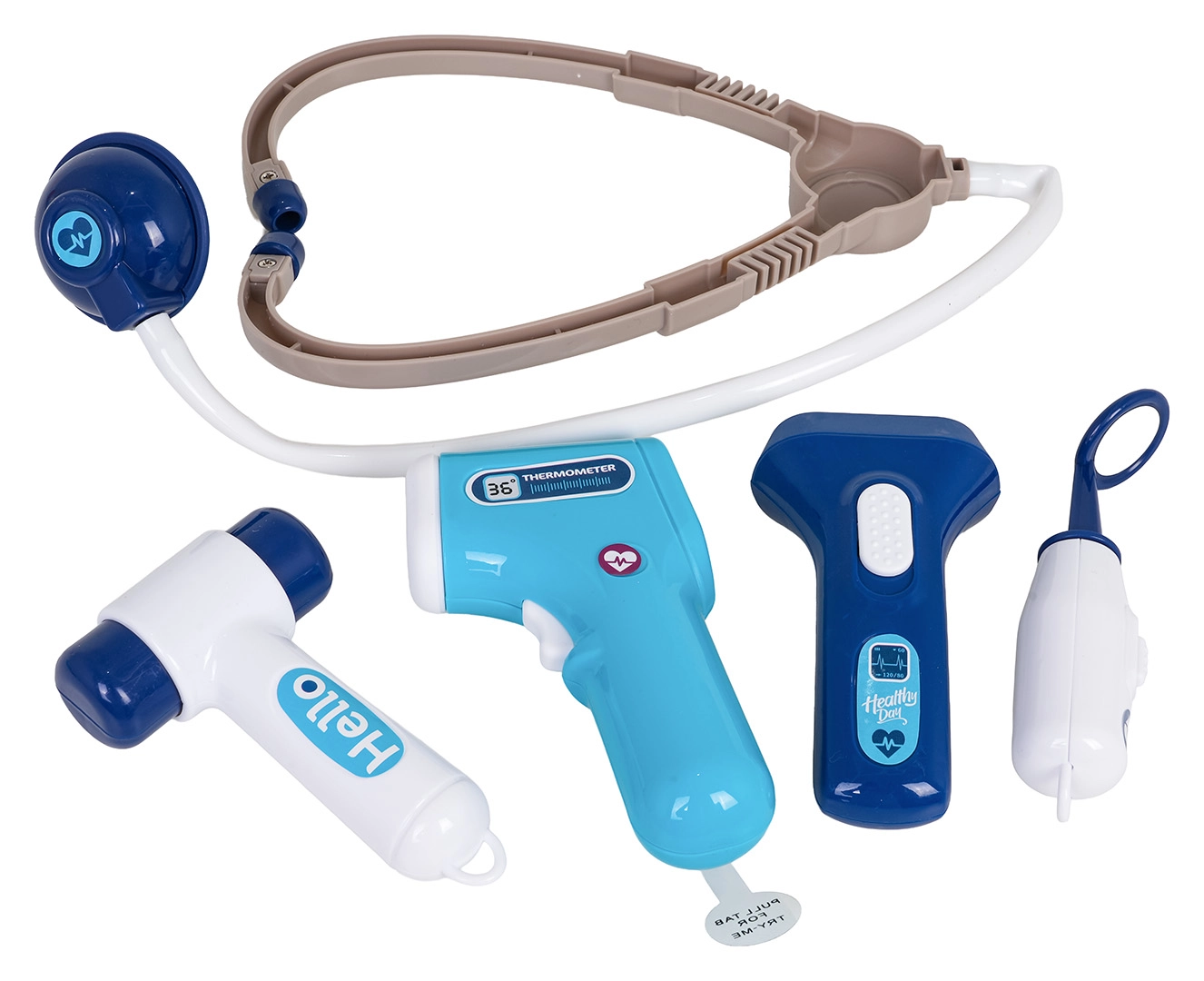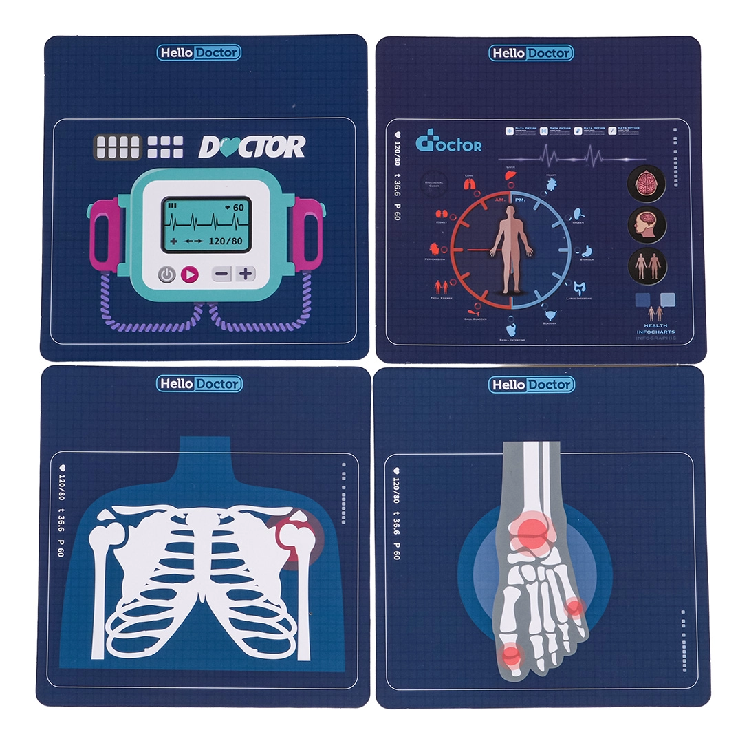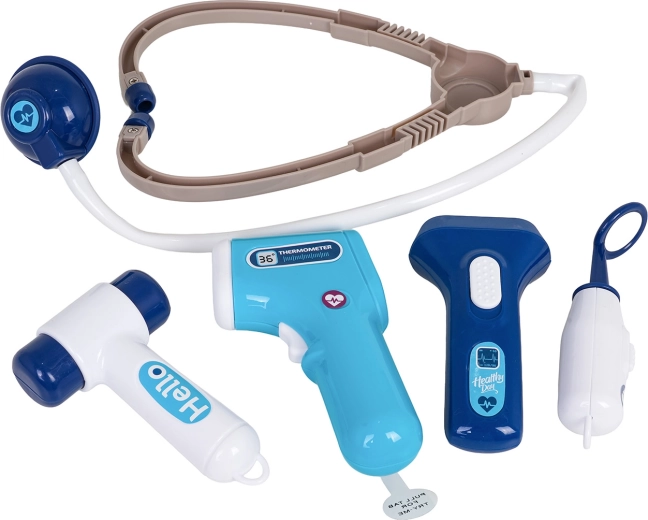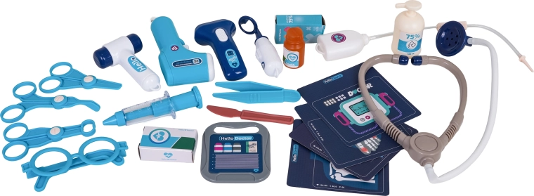 Stetoskop, bezdotykowy termometr ze światłem, strzykawka, nożyczki, pęseta, lusterko, młoteczek, okulary, karta pacjenta i inne dodatki do kreatywnej zabawy.