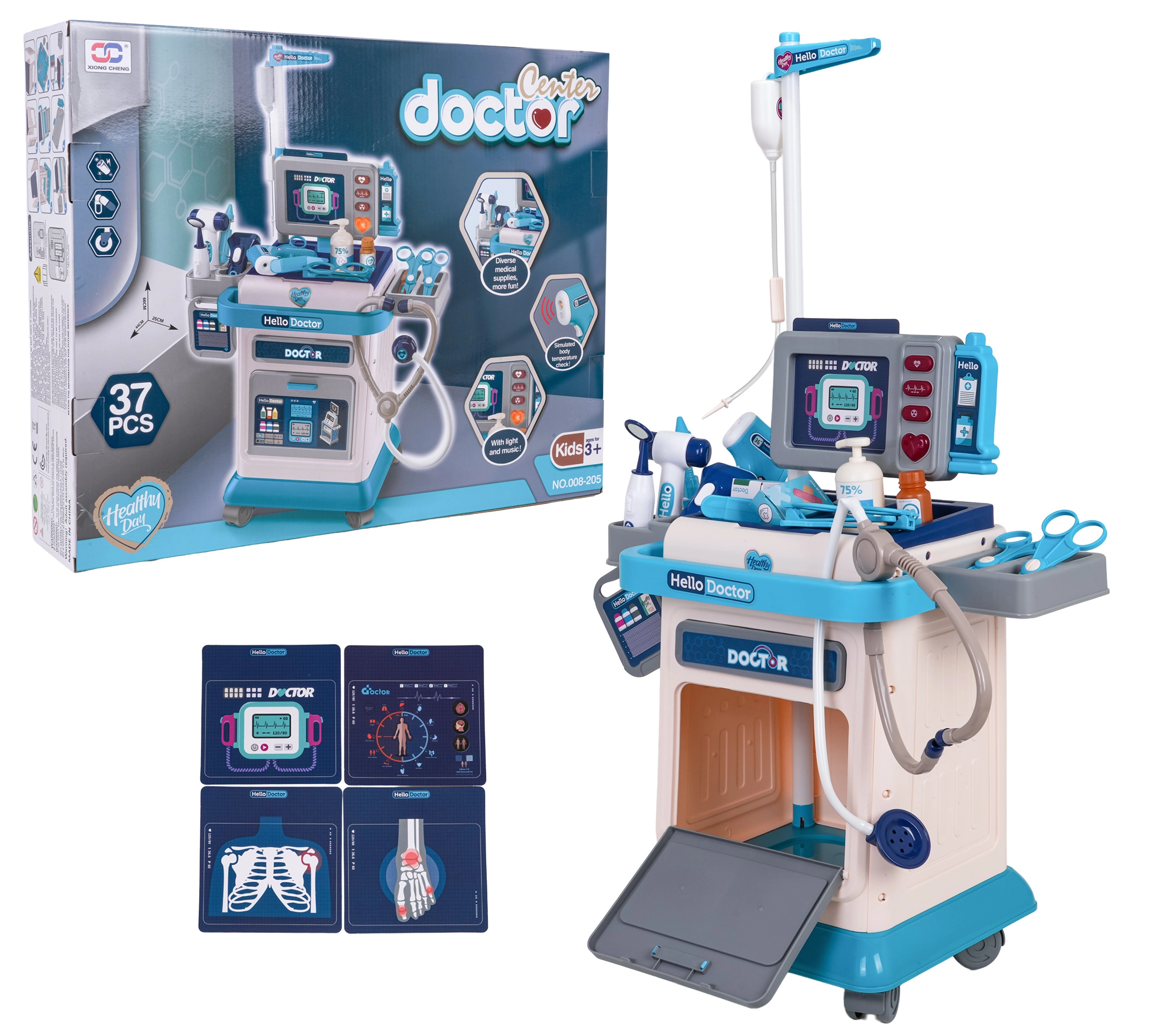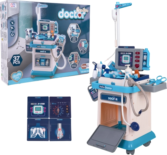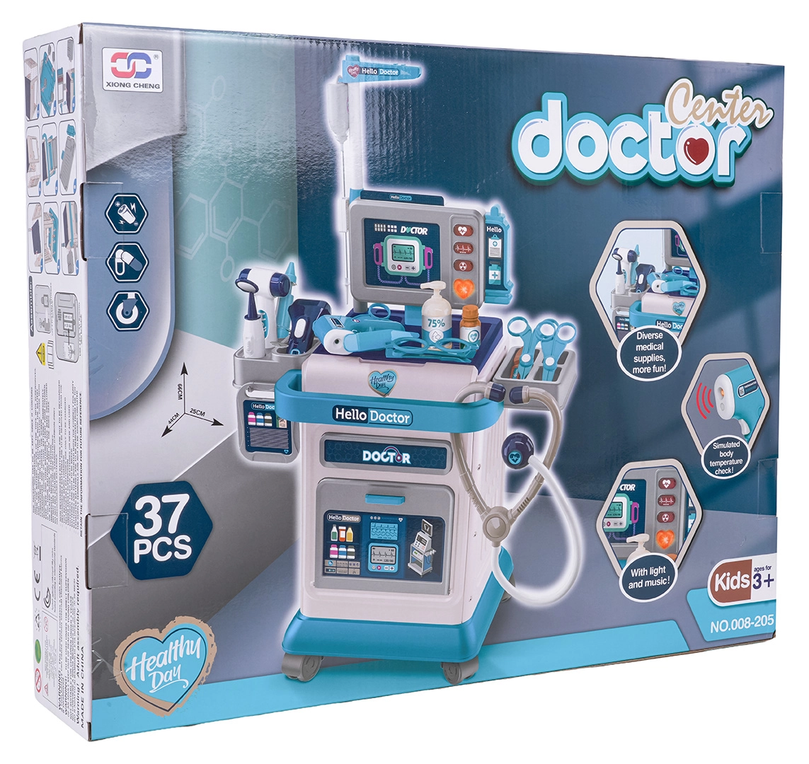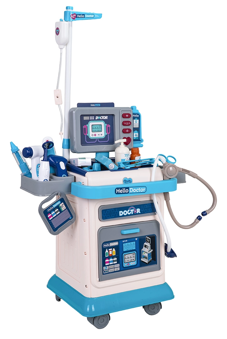 Ten bogato wyposażony zestaw lekarski dla dzieci zapewnia świetną i edukacyjną zabawę w lekarza. Stabilny wózek na kółkach z regulowanym uchwytem ułatwia przemieszczanie całego gabinetu, a panel monitora oferuje efekty świetlne i dźwiękowe – uderzenia serca, pomiar temperatury, dźwięk tomografii i alarm. W zestawie znajdują się wymienne zdjęcia do EKG i tomografii, które wspierają realistyczną zabawę.