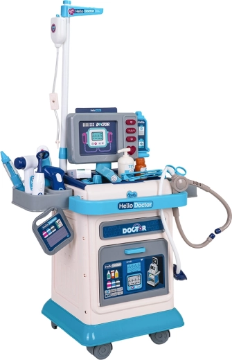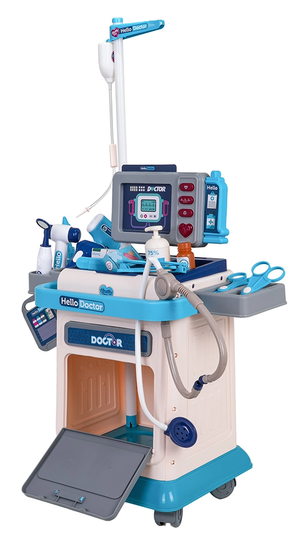 Dzieci znajdą w komplecie wszystko, co potrzebne: stetoskop, bezdotykowy termometr ze światłem, strzykawkę, nożyczki, pęsetę, lusterko, neurologiczny młoteczek, okulary oraz drobne akcesoria, takie jak karta pacjenta, buteleczka z „dezynfekcją”, pudełko z plastrami i lekami czy stojak do kroplówki (IV). Wózek ma praktyczną szufladę i uchwyty do przejrzystego przechowywania narzędzi.