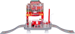Stacja paliw, znaki drogowe, lampy oraz wjazd/wyjazd tworzą wiarygodne otoczenie strażnicy i wspierają dziecięcą wyobraźnię.