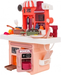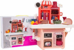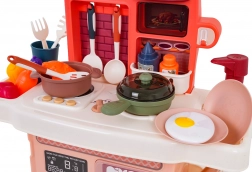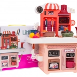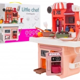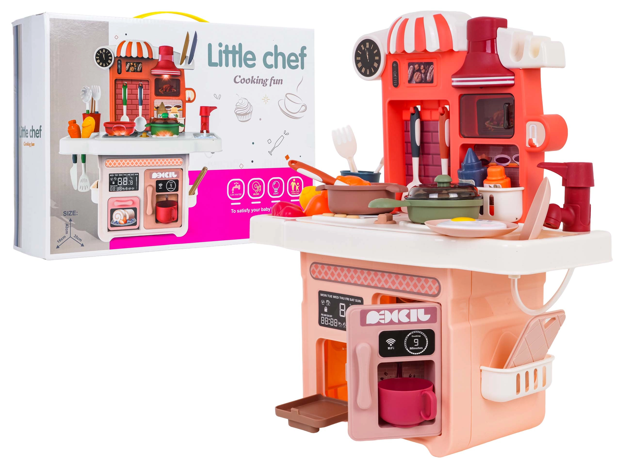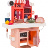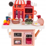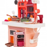 Prawdziwą atrakcją jest działający kran – z bateryjnej pompki woda płynie do zlewu, więc dzieci mogą „myć naczynia” jak w prawdziwej kuchni. W zestawie znajduje się także otwierany piekarnik, imitacja ekspresu do kawy oraz podświetlany okap. Bogate akcesoria (garnki, patelnia, przybory, talerzyki i produkty) poszerzają możliwości zabawy.