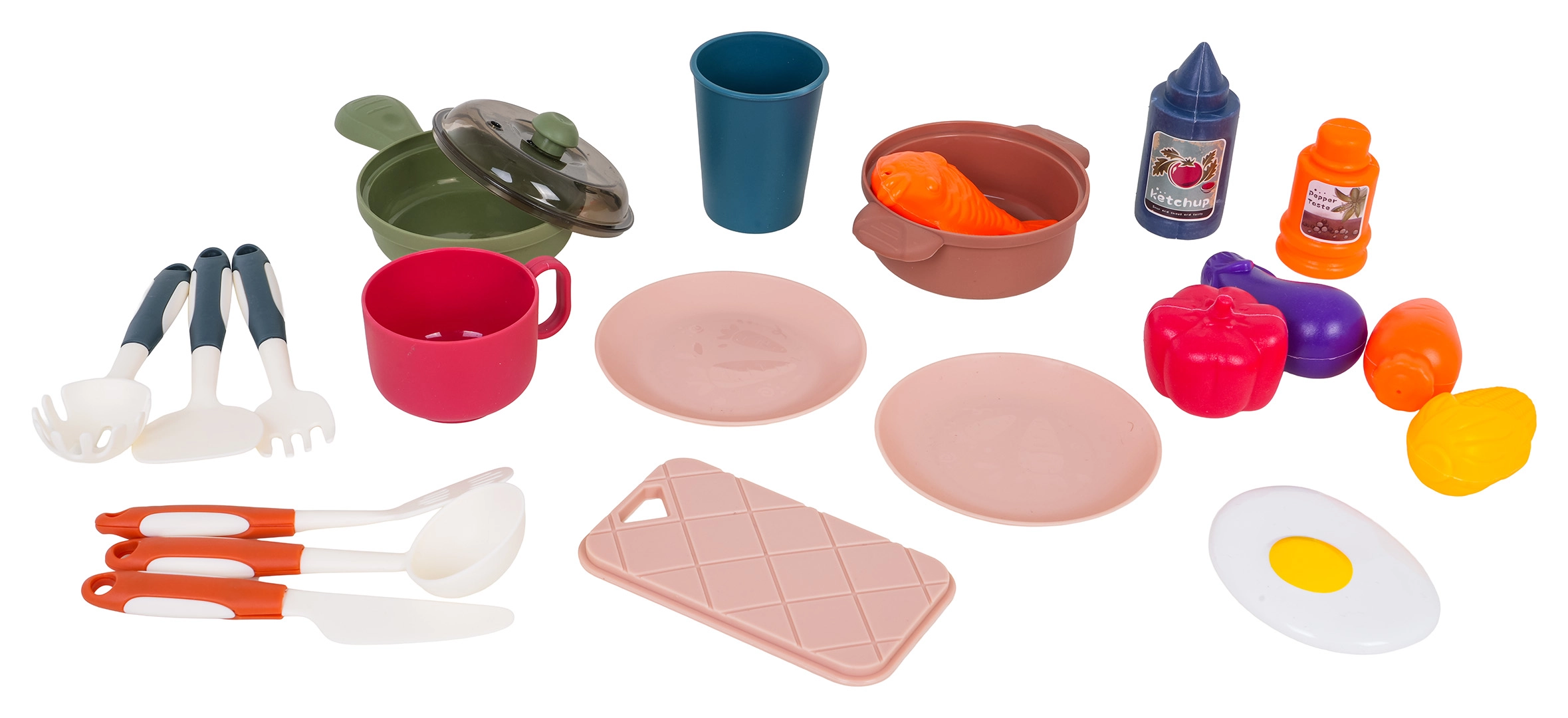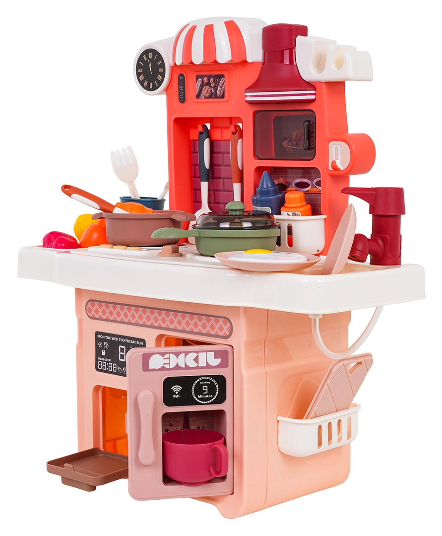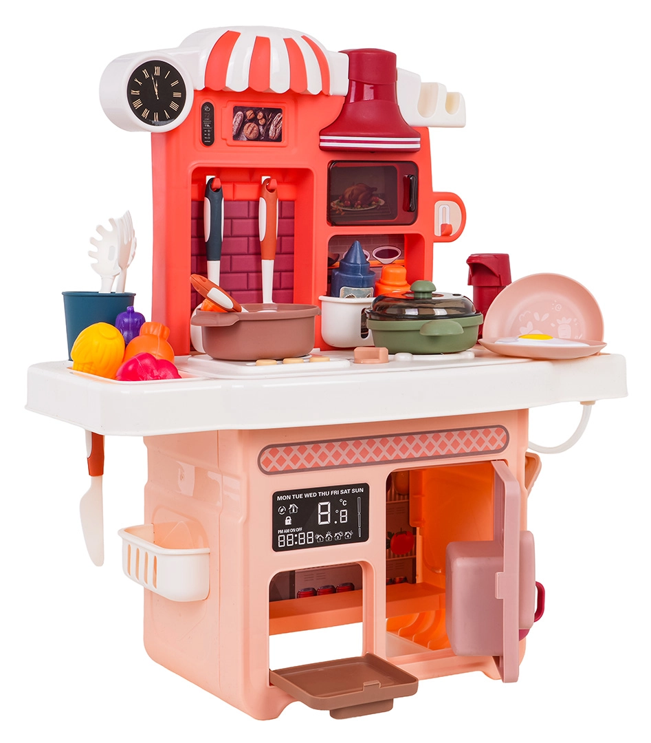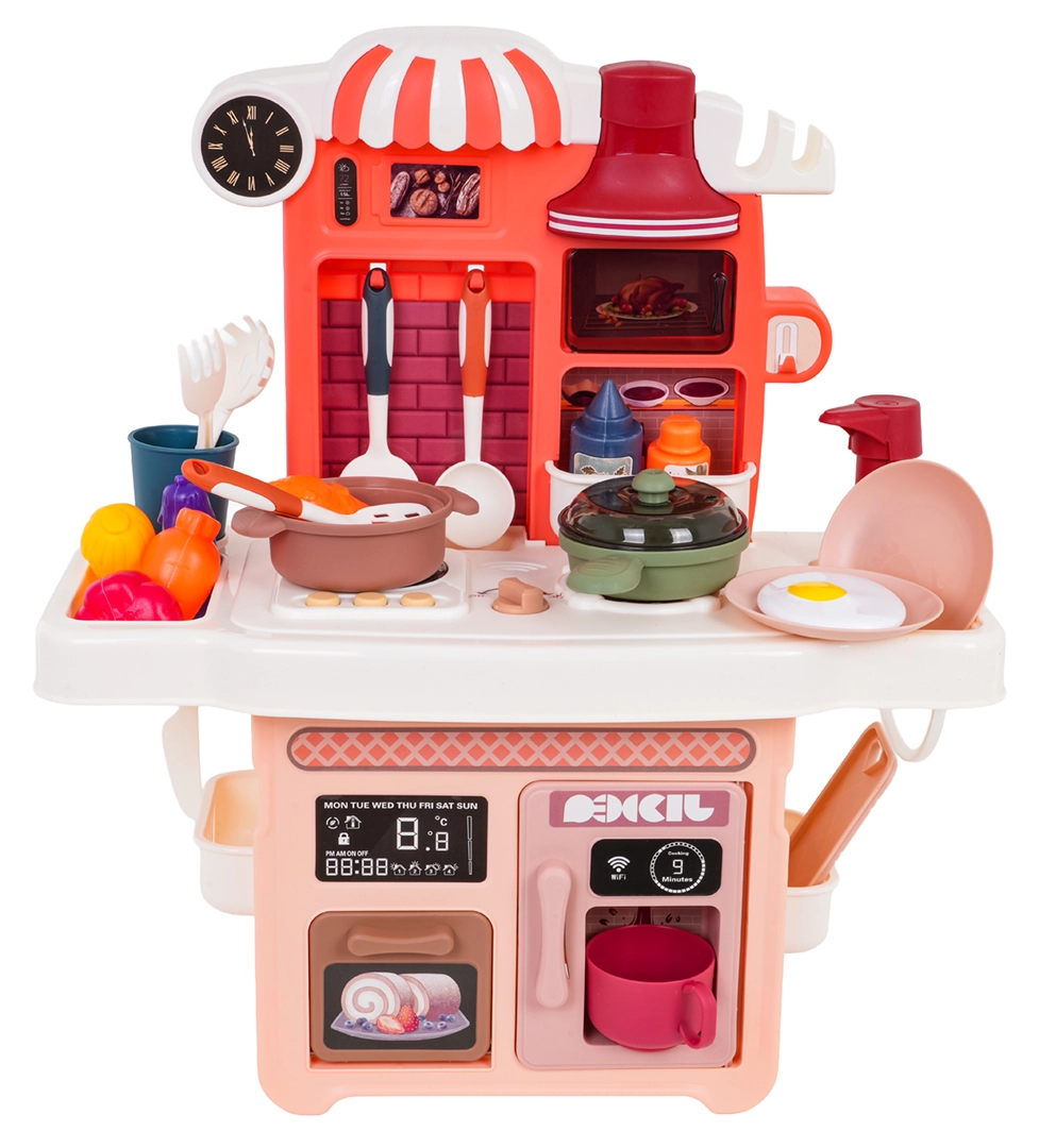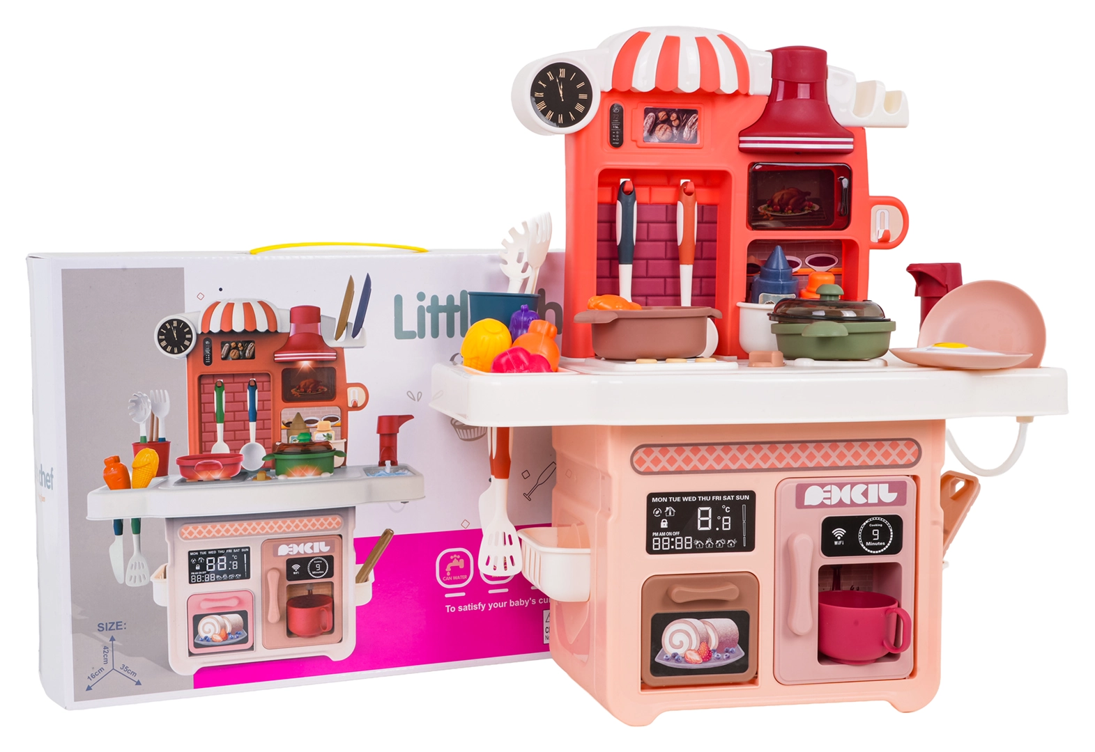 Ta starannie wykonana kuchnia dla dzieci w żywych kolorach wspiera wyobraźnię, zabawę w odgrywanie ról i motorykę małą. Po przekręceniu pokręteł rozlegają się autentyczne dźwięki gotowania, a jednocześnie zapalają się podświetlane palniki. Po naciśnięciu przycisków kuchnia odtwarza piosenki, rymowanki i wskazówki bezpieczeństwa, które w przystępny sposób uczą dzieci właściwych nawyków.