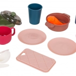 Patelnia, garnek z pokrywką, talerzyki, filiżanki, przybory kuchenne i różne produkty (ryba, warzywa, jajko) rozwijają kreatywność i umiejętności społeczne.