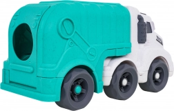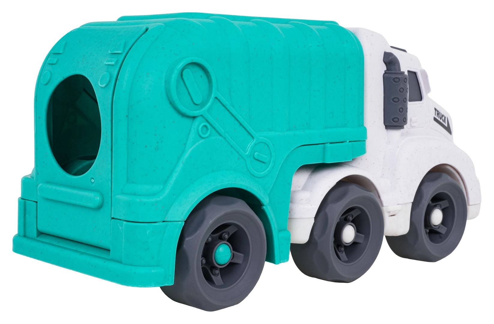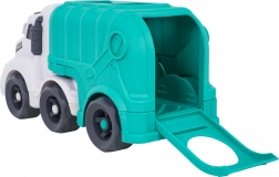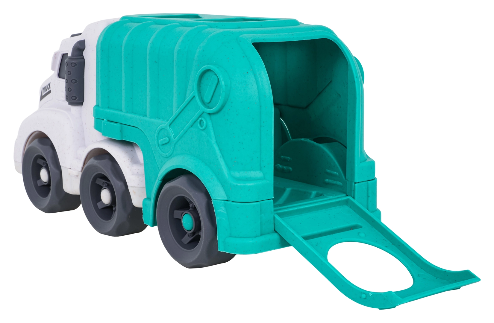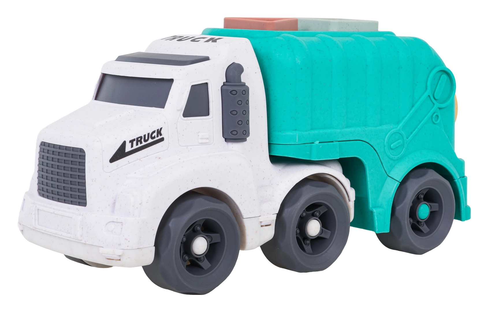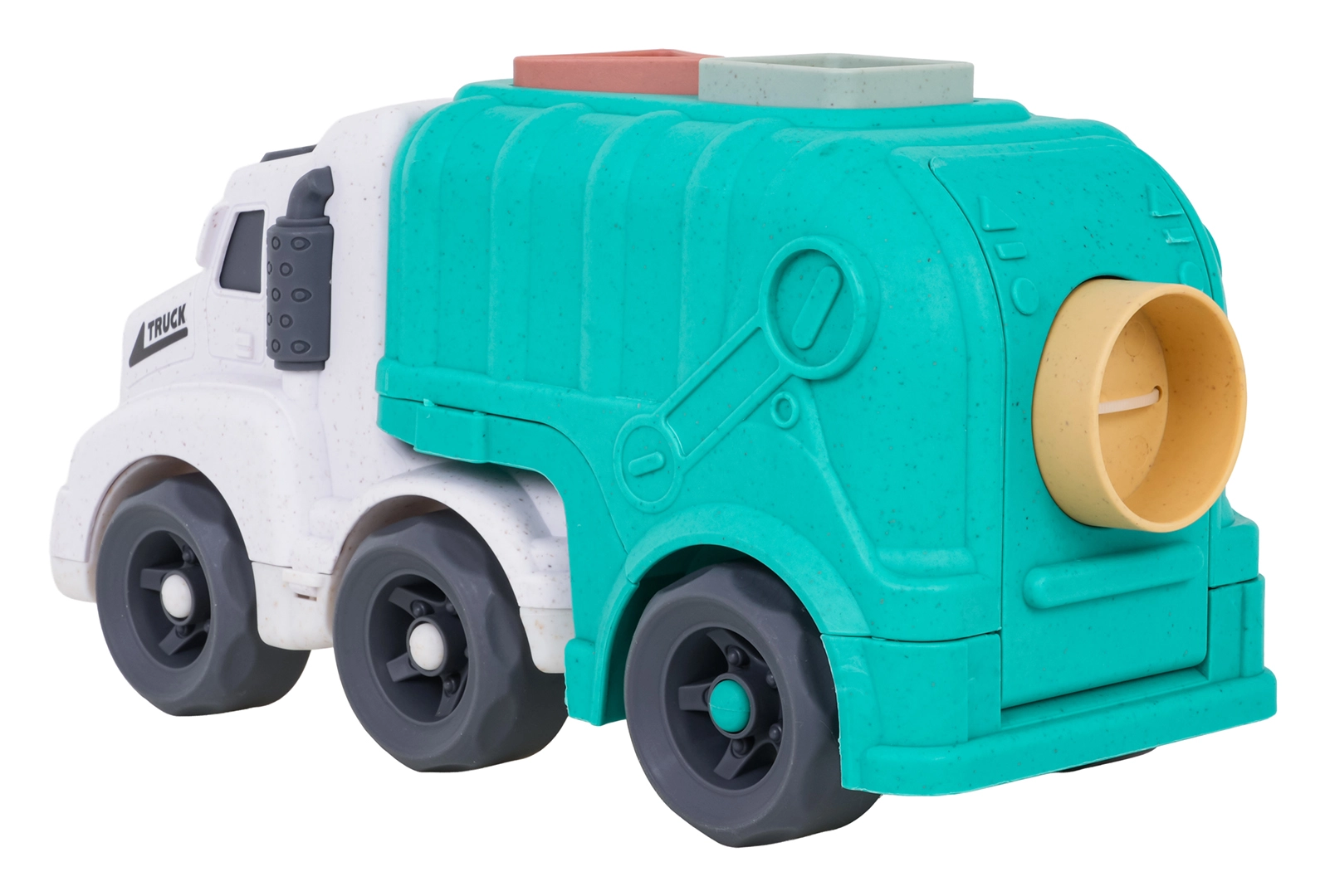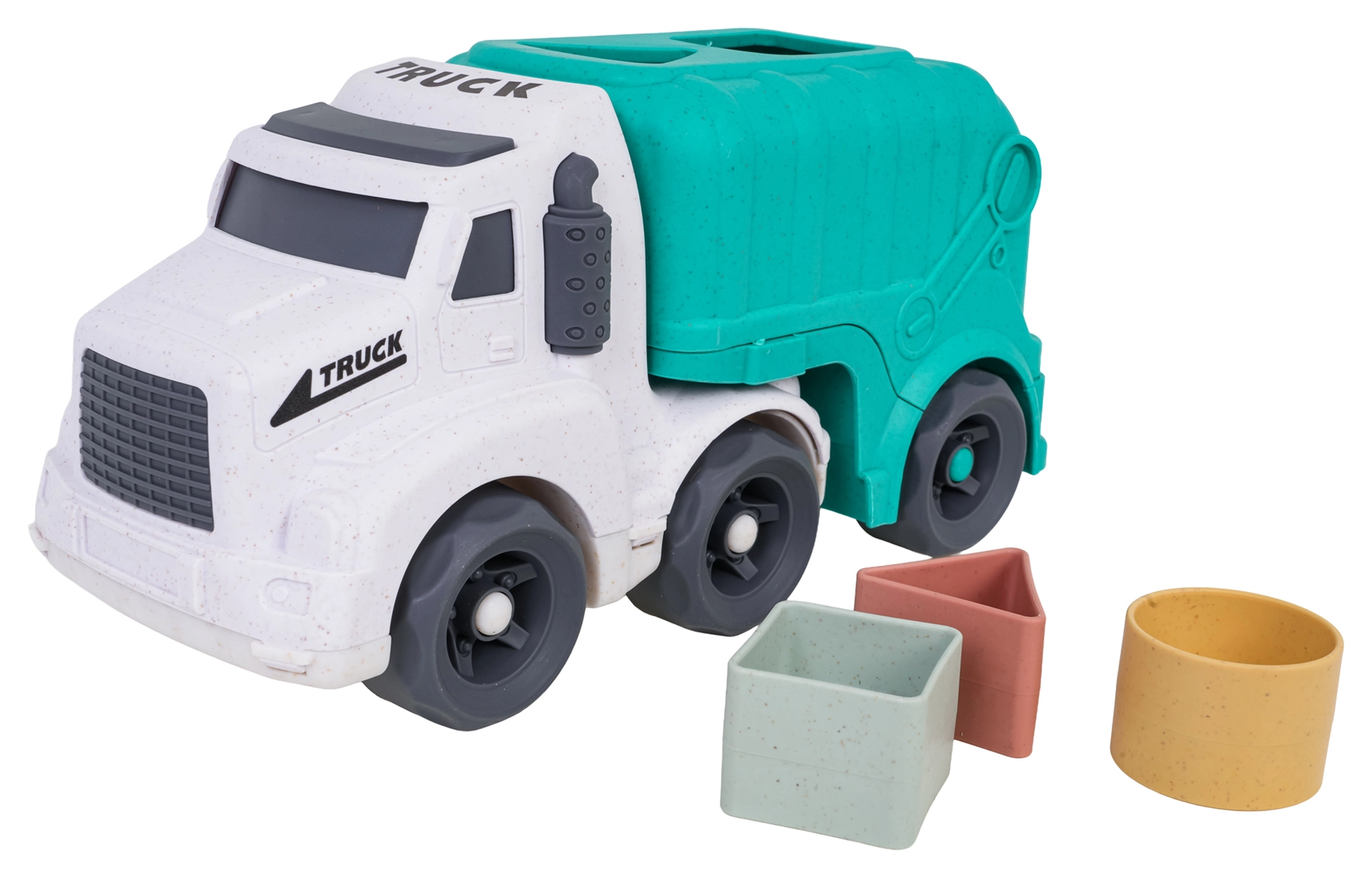 Ekologiczna śmieciarka z sortownikiem z wytrzymałego bioplastiku dla dzieci od 18 miesięcy. Oferuje sortowanie kształtów na dachu i na tylnych drzwiczkach, otwieraną tylną klapę dla łatwego wyjmowania klocków oraz gładkie, obłe kształty bez ostrych krawędzi. Idealna do zabawy w domu i na zewnątrz oraz do rozwoju małej motoryki i rozpoznawania kształtów.