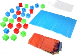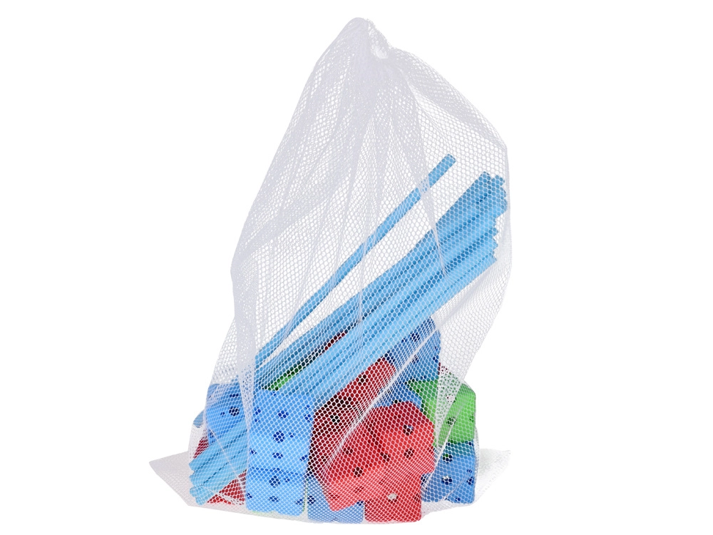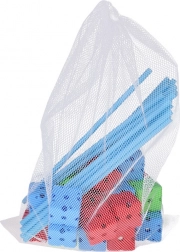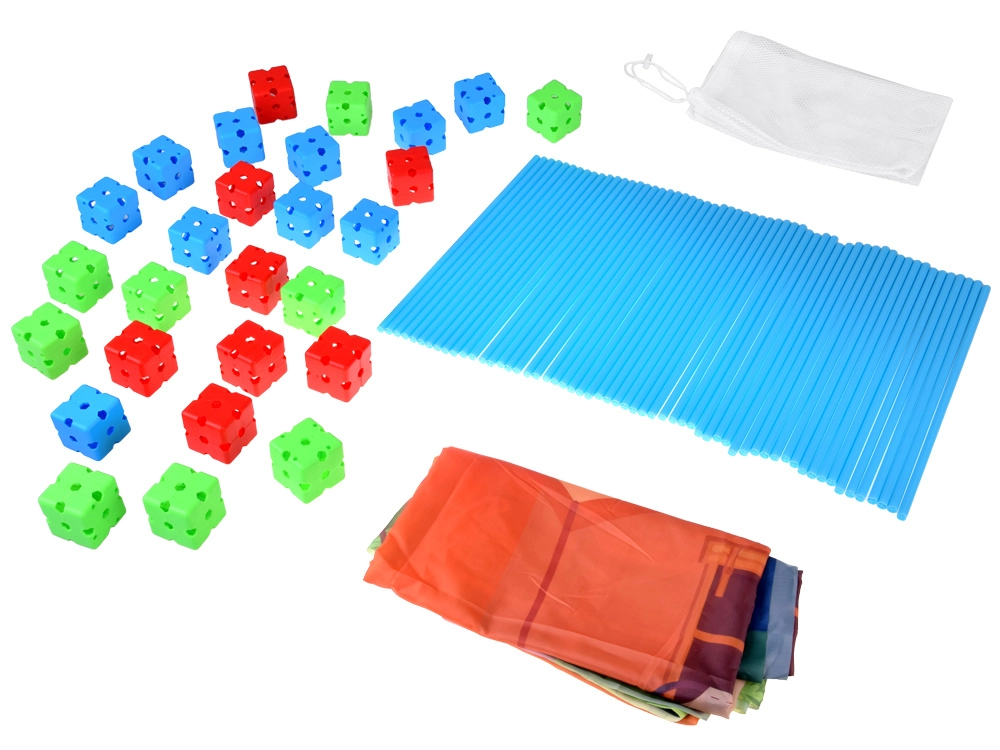 - 58× patyczek (ok. 38 cm długości, ok. 1 cm średnicy), 29× kostka łącząca (ok. 5 × 5 × 5 cm), 1× tekstylna płachta z nadrukiem (ok. 230 × 155 cm), 1× siatkowy woreczek do przechowywania