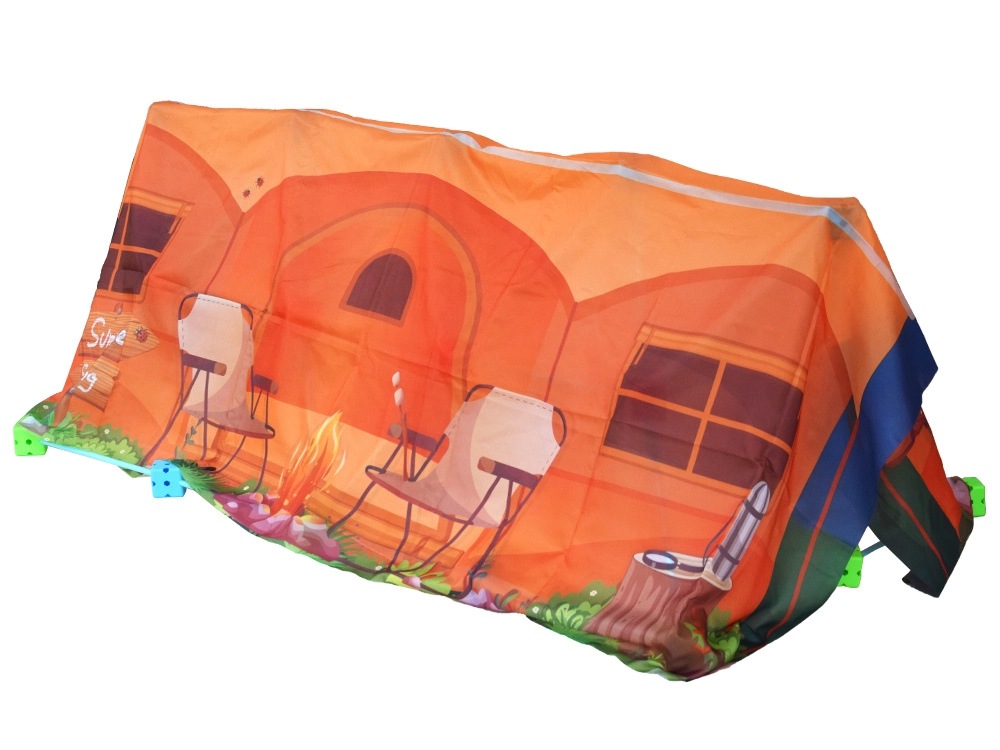W zestawie znajduje się kolorowa tekstylna płachta z motywem biwakowym. Wystarczy przerzucić ją przez konstrukcję, aby stworzyć przytulne miejsce do zabawy.