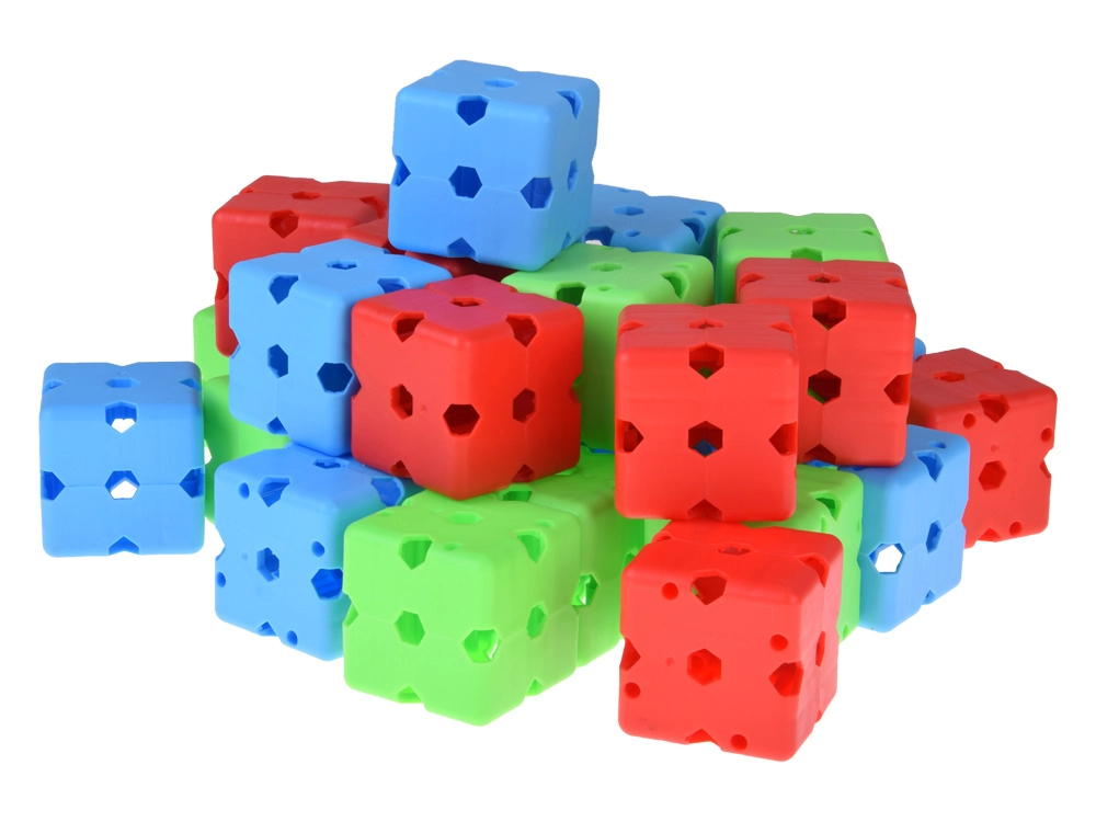 Kolorowe kostki z otworami w wielu kierunkach pozwalają łączyć patyczki pod różnymi kątami. Dzięki temu z łatwością zbudujesz wieże, kopuły i rozbudowane bazy do zabawy.