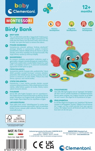 Urocza montessoriańska skarbonka ptaszek CLEMENTONI BABY. Bezpieczne materiały, łatwe opróżnianie, idealna do rozwijania kompetencji finansowych i jako prezent.