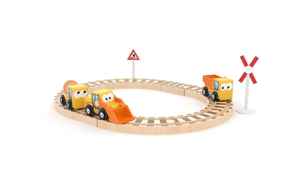Ten wysokiej jakości drewniany zestaw łączy świat pociągów i budowy w jedno doświadczenie zabawy. Dzieci mogą układać tory, włączać maszyny budowlane i tworzyć własne historie z placu budowy. Bezpieczne materiały i gładkie wykończenie gwarantują przyjemną i bezpieczną zabawę.
