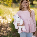 Błyszczący złoty róg i delikatne różowe detale nadają pluszakowi bajkowego uroku, który dzieci kochają.