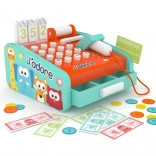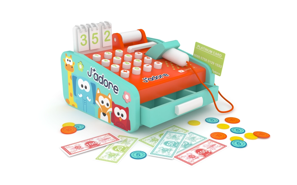 Kasa oferuje przyciski, wysuwaną szufladę na pieniądze oraz akcesoria, dzięki którym dzieci mogą przyjmować płatności i wydawać „resztę”. Wykonana z ekologicznych i bezpiecznych materiałów, odporna na codzienną zabawę.