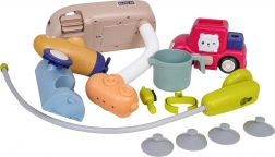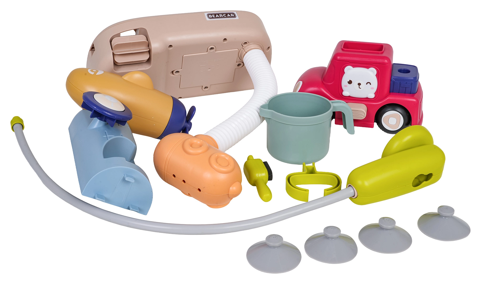 Samochodzik, kubeczek i więcej elementów wodnych wspierają kreatywną zabawę, nalewanie, pryskanie oraz rozwój małej motoryki.