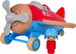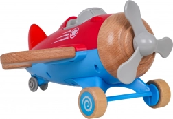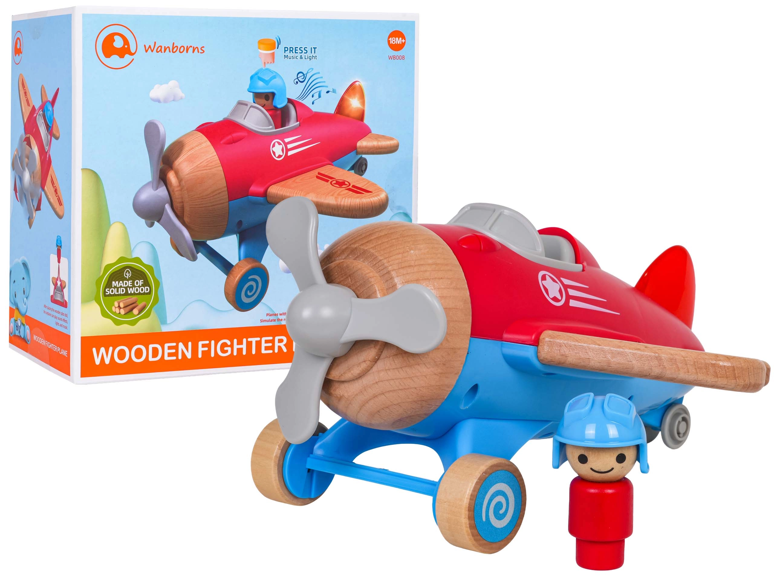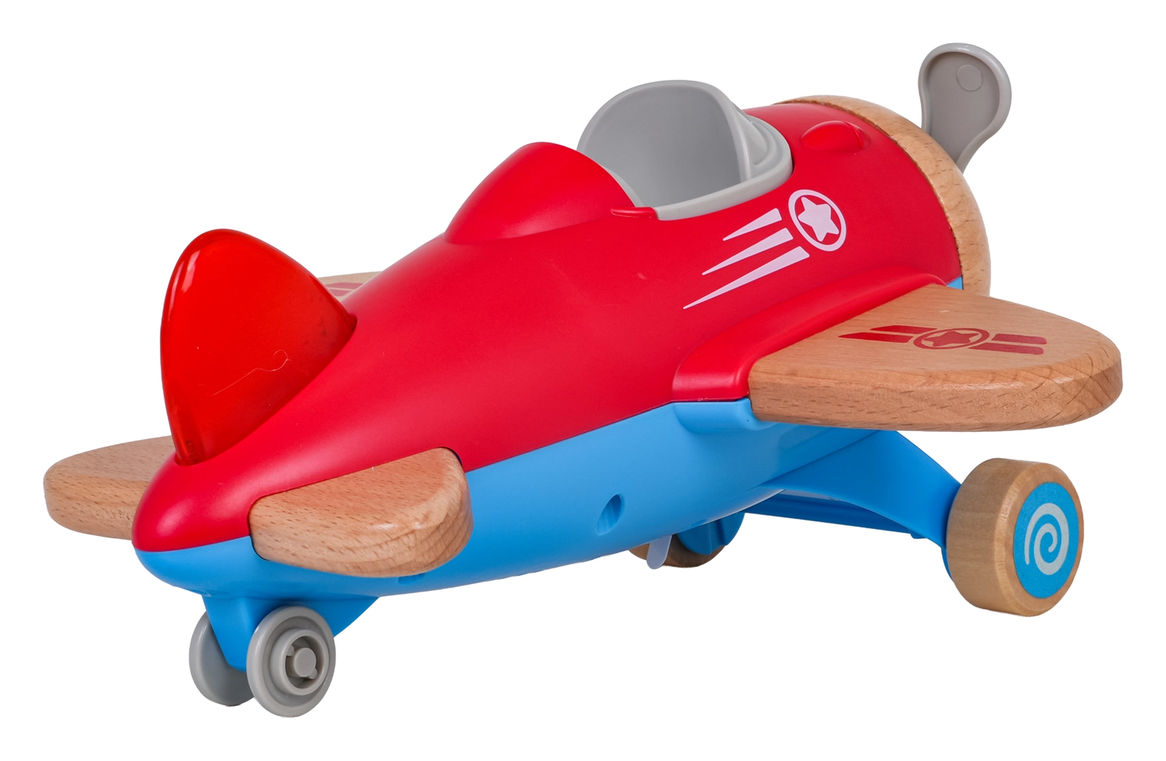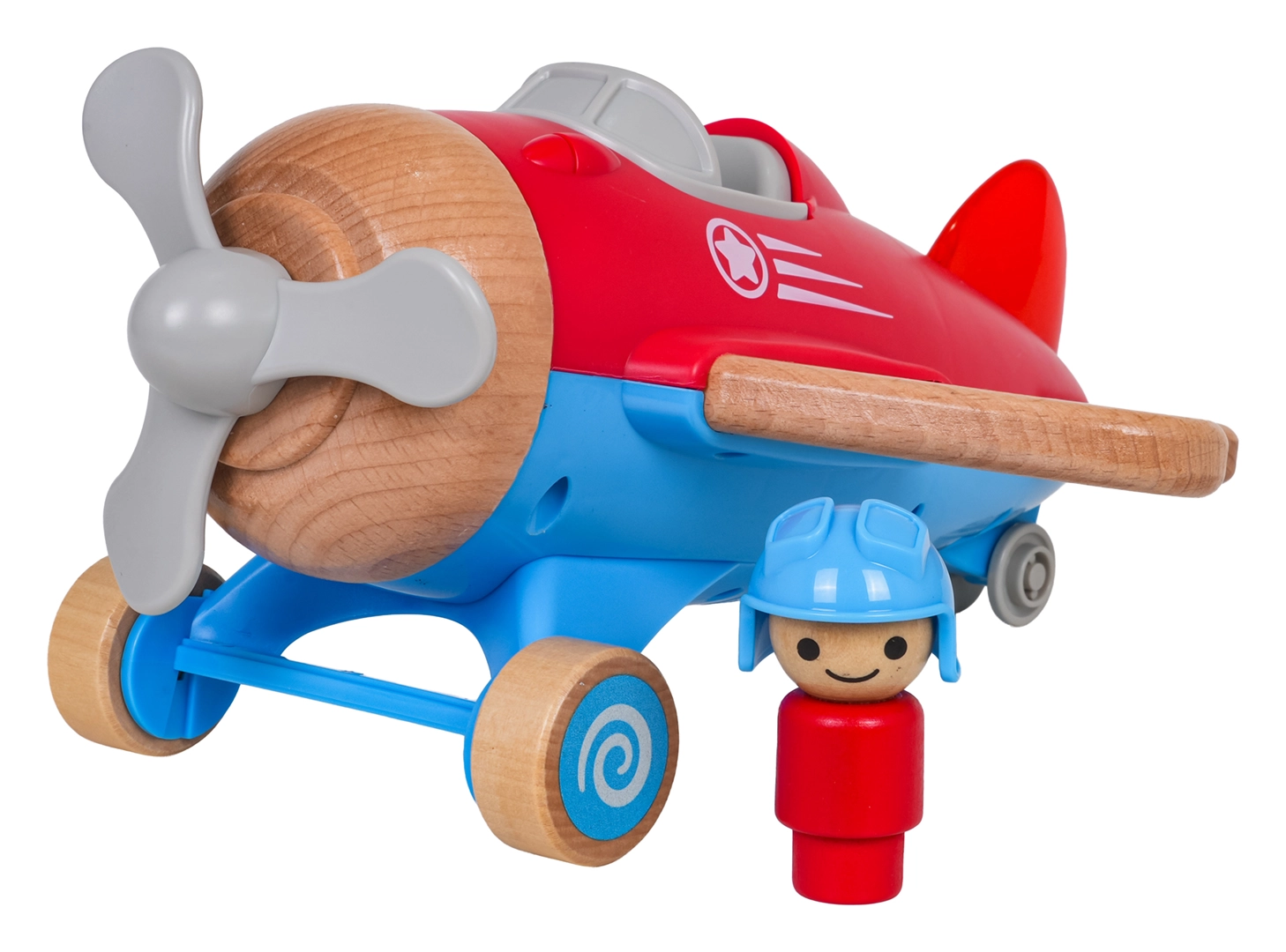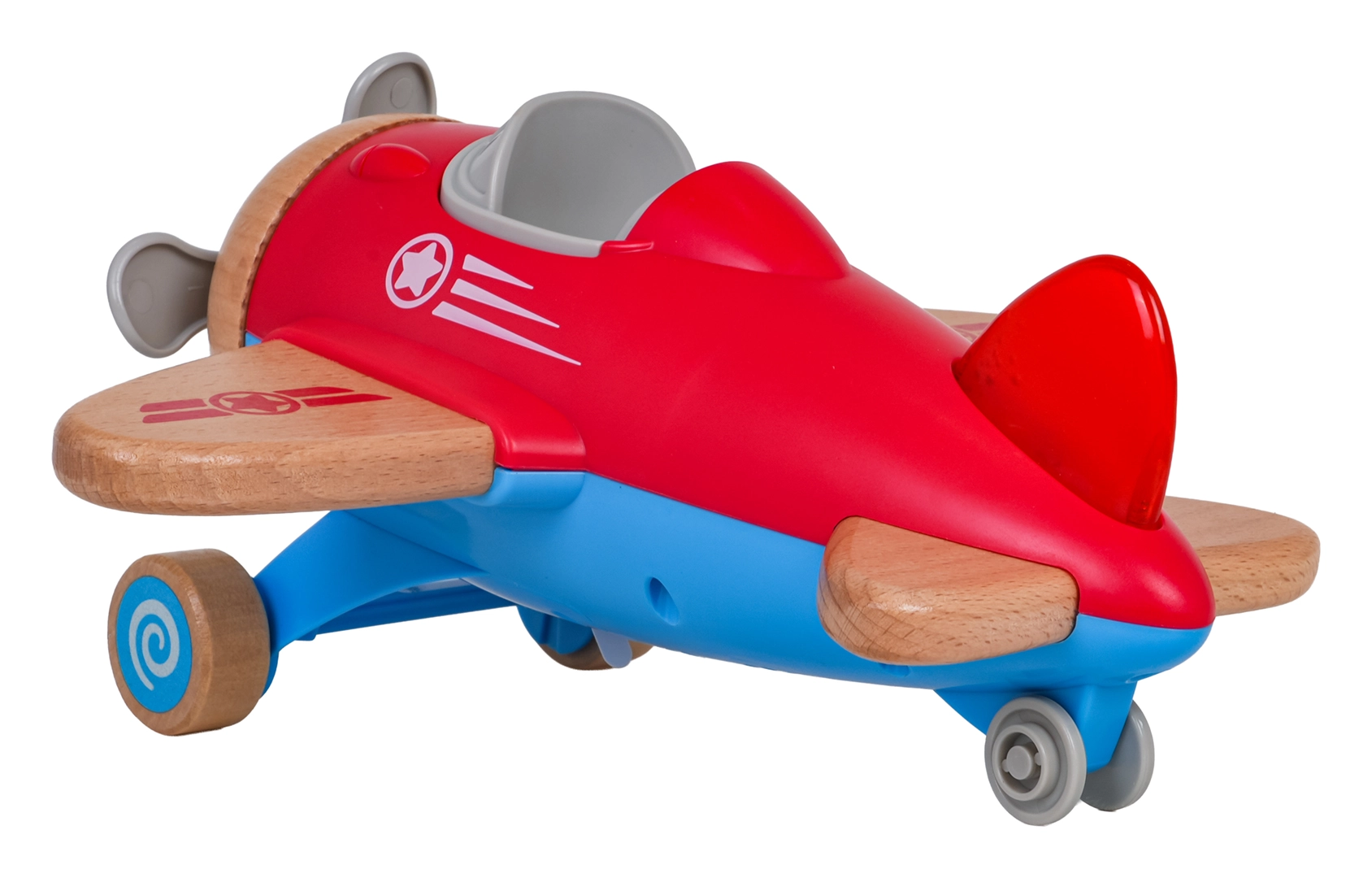 Kolorowy drewniany samolot dla najmłodszych od 18 miesięcy oferuje efekty świetlne i dźwiękowe, obracające się śmigło oraz ruchome kółka. Połączenie drewna i wysokiej jakości plastiku zapewnia trwałość i bezpieczną zabawę bez ostrych krawędzi. Po naciśnięciu figurki pilota odtwarzane są melodie i dźwięki startu samolotu, a tylne skrzydło się podświetla.