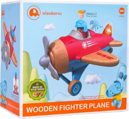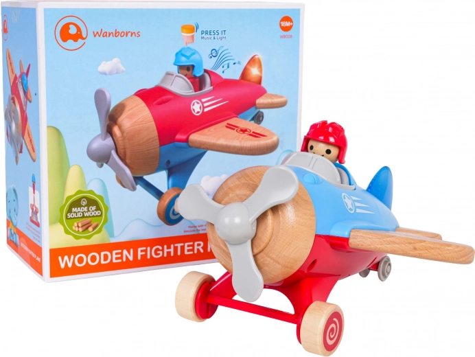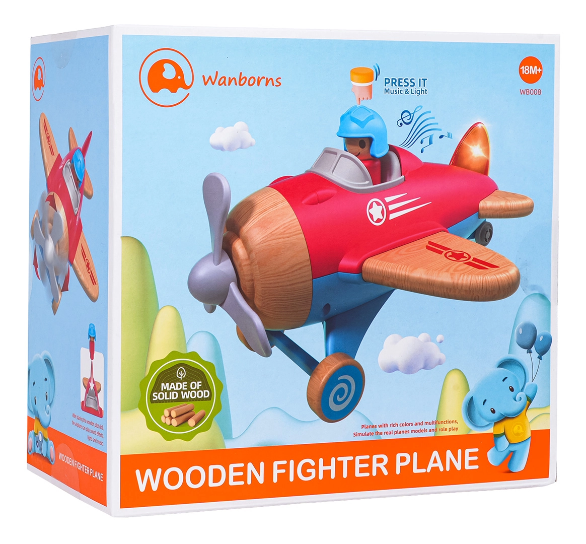Interaktywny drewniany samolot dla dzieci od 18 miesięcy łączy wysokiej jakości drewno i wytrzymały plastik, oferuje efekty świetlne, melodie i dźwięki startu. Ma obracające się śmigło, swobodnie toczące się kółka do pchania i jest bezpieczny, bez ostrych krawędzi. Baterie są częścią zestawu.