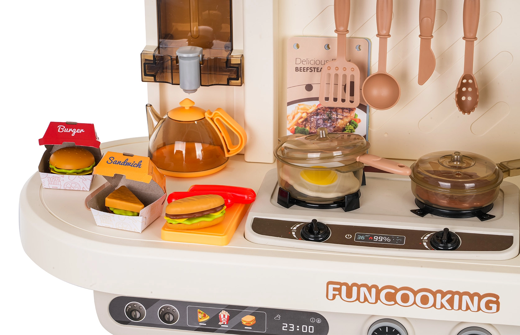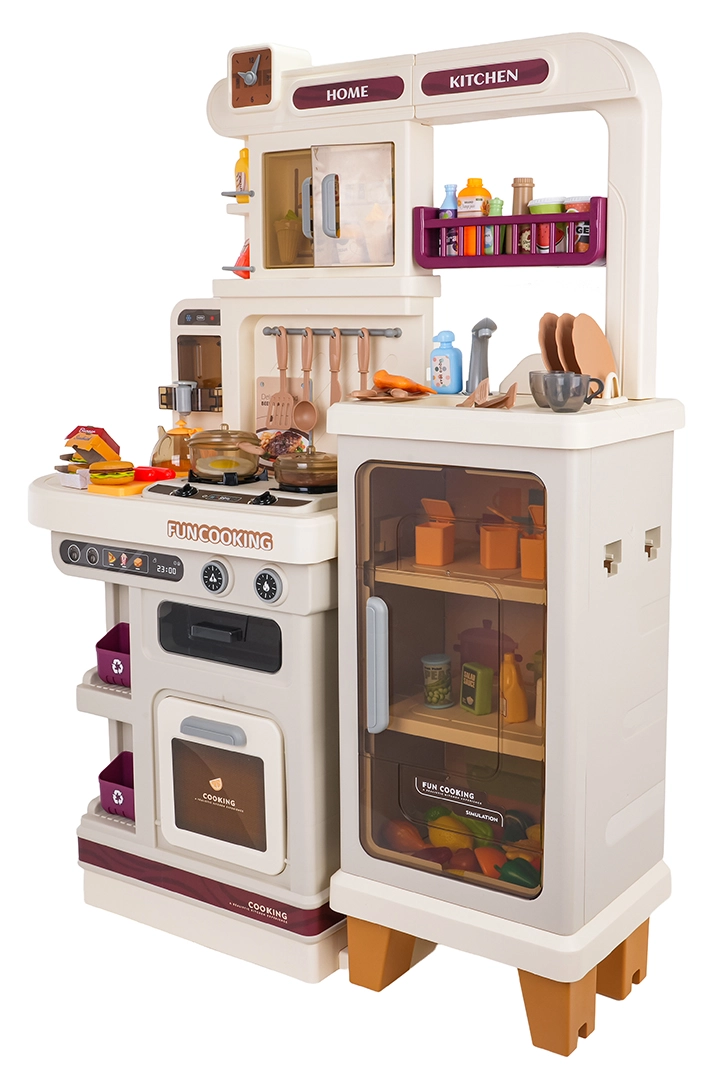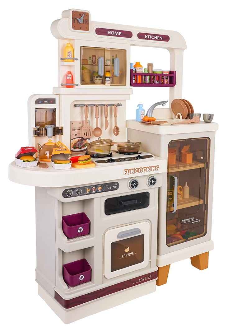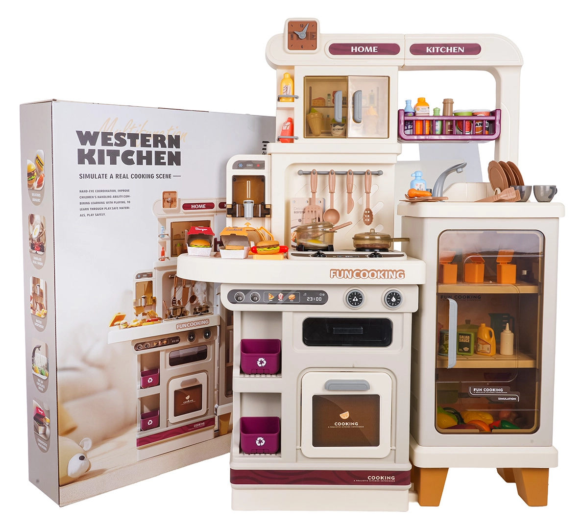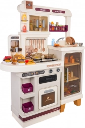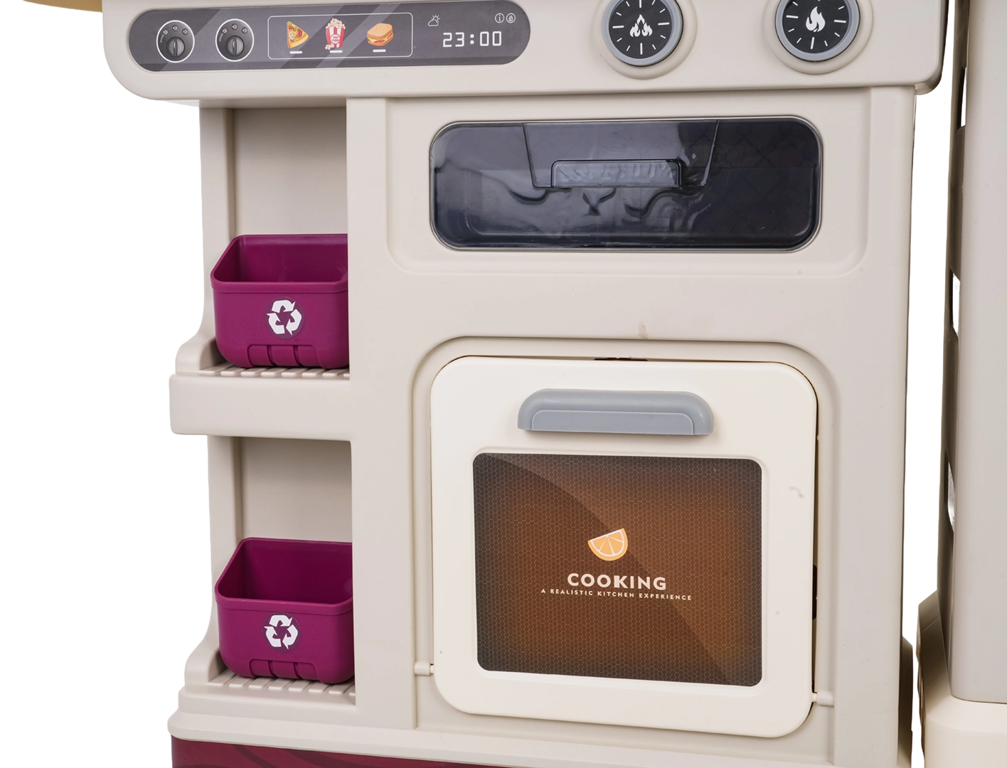 Ta wielofunkcyjna kuchnia w eleganckim beżowym kolorze wykonana jest z wysokiej jakości, wytrzymałego plastiku i zachwyci każde dziecko realistycznymi funkcjami. Podświetlane palniki wydają dźwięki gotowania i smażenia, z jednego palnika unosi się delikatna para, a z działającego kranu płynie woda. Otwierany piekarnik i lodówka wraz z półkami i haczykami pomagają przechowywać wszystkie akcesoria w porządku.