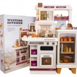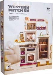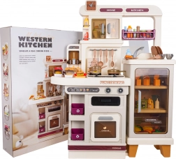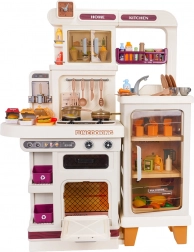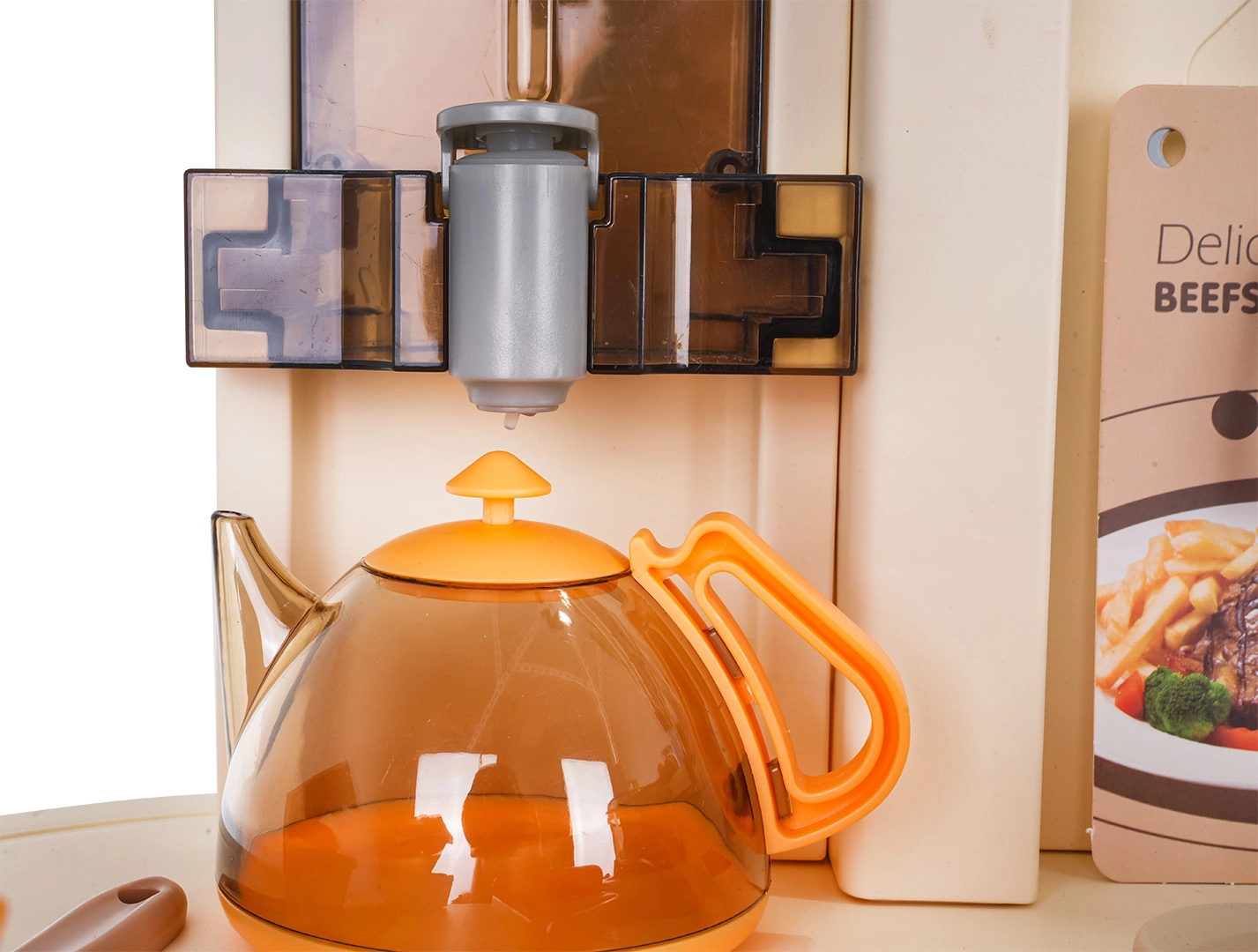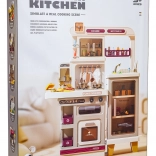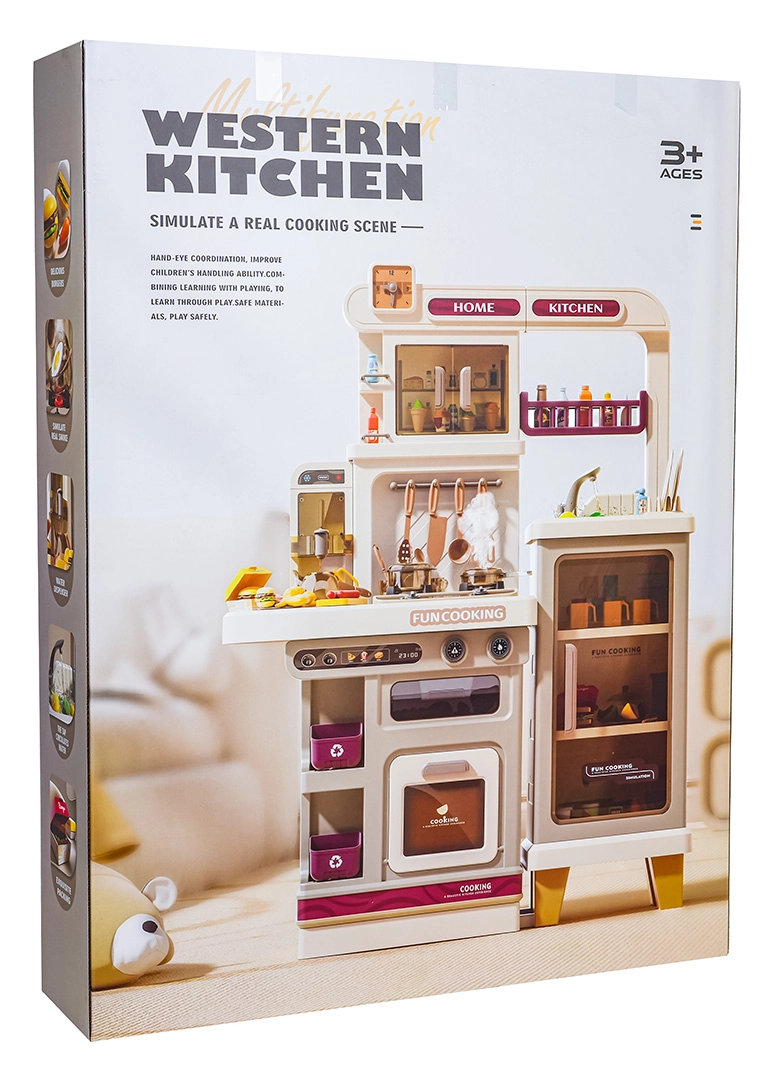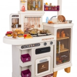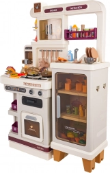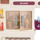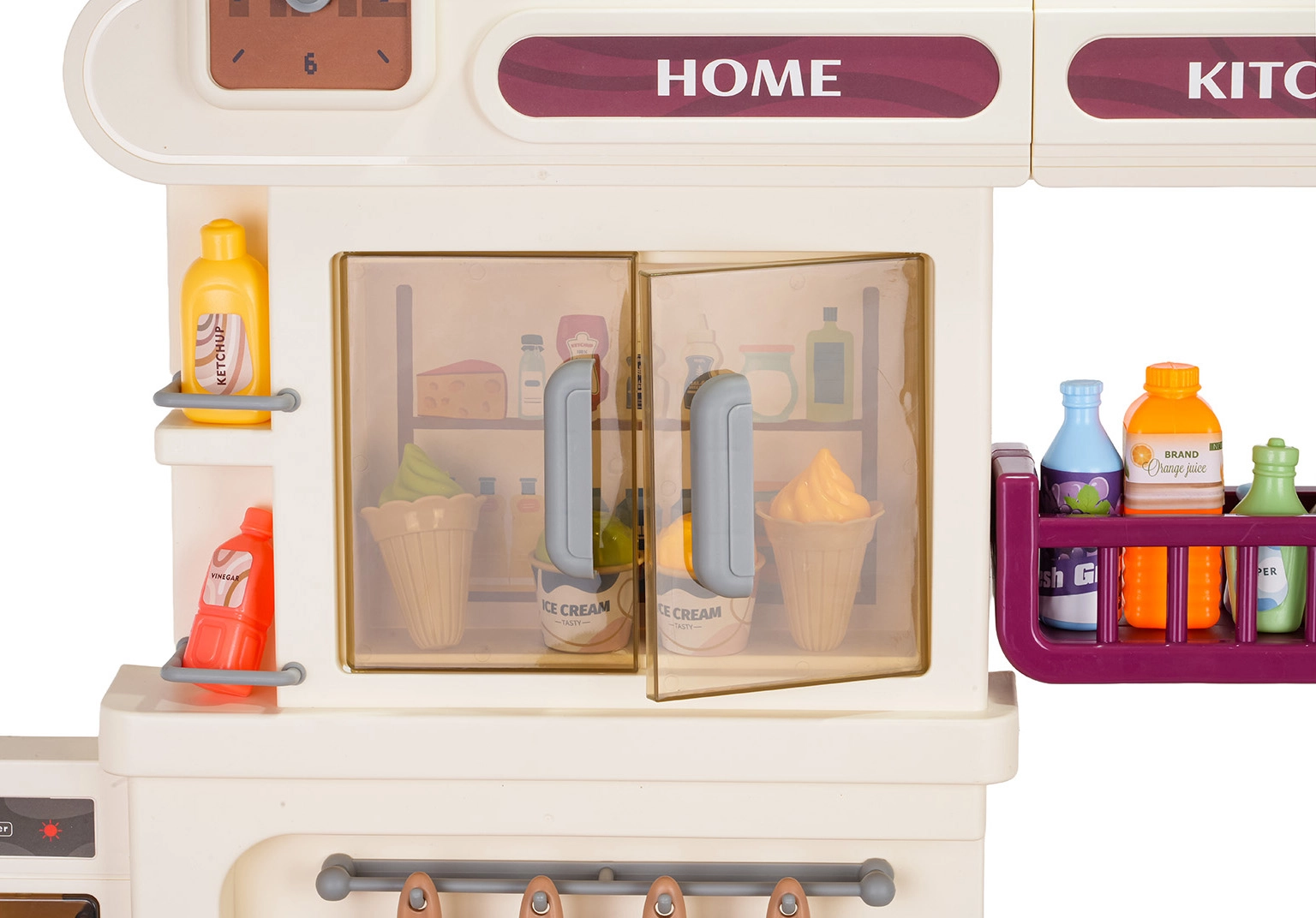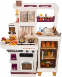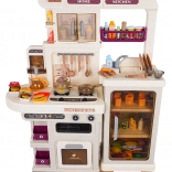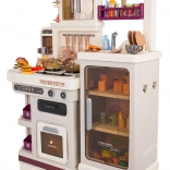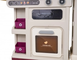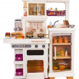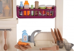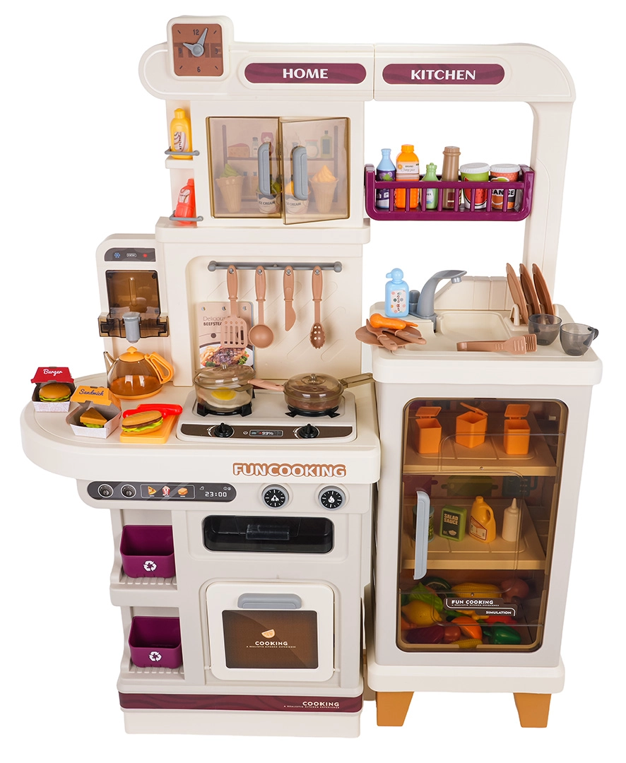 Ta wielofunkcyjna kuchnia w eleganckim beżowym kolorze wykonana jest z wysokiej jakości, wytrzymałego plastiku i zachwyci każde dziecko realistycznymi funkcjami. Podświetlane palniki wydają dźwięki gotowania i smażenia, z jednego palnika unosi się delikatna para, a z działającego kranu płynie woda. Otwierany piekarnik i lodówka wraz z półkami i haczykami pomagają przechowywać wszystkie akcesoria w porządku.