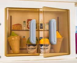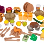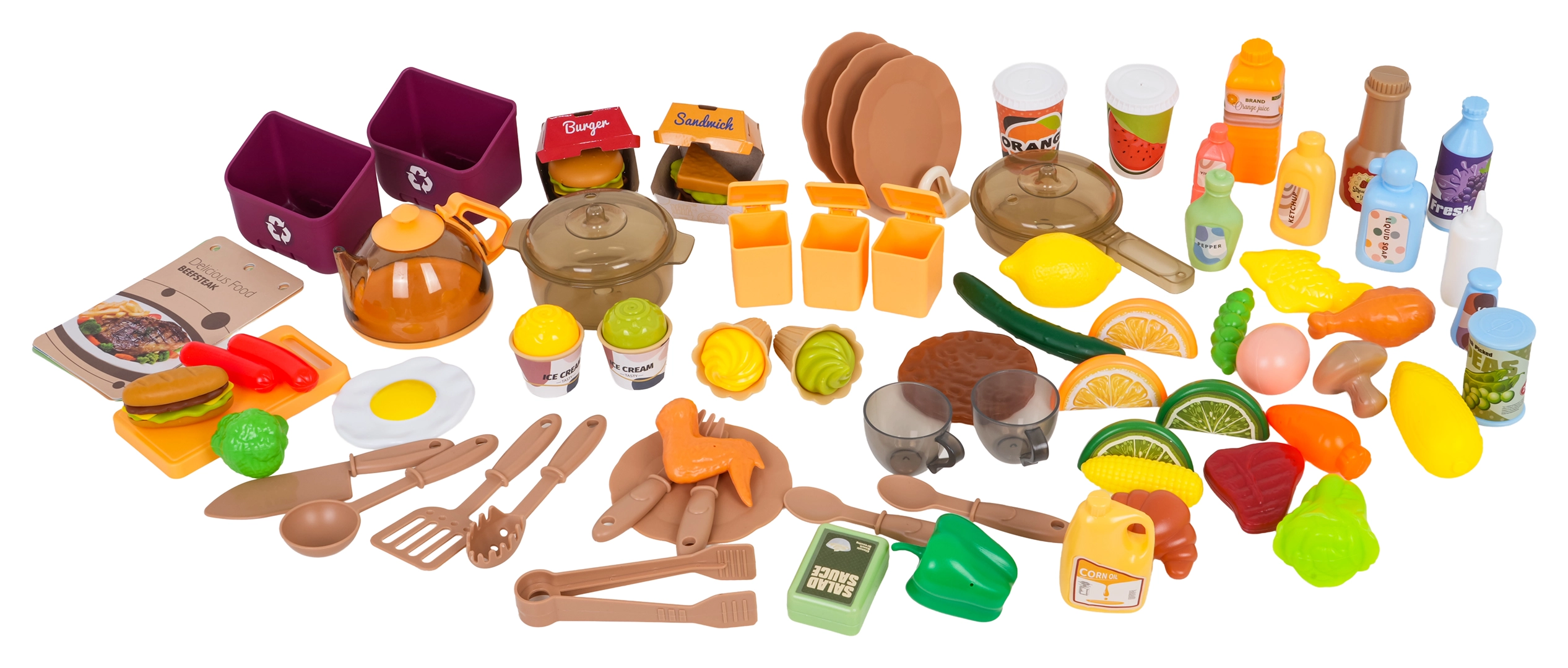 W opakowaniu znajdziesz 93 elementy – garnki, patelnię, czajniczek, naczynia, sztućce, przybory kuchenne, przyprawniki, kosze na śmieci oraz bogaty wybór produktów spożywczych i napojów. Nie brakuje zegarów z ruchomymi wskazówkami oraz kartek menu dla jeszcze większej dawki wyobraźni. Kuchnia idealnie wspiera rozwój małej motoryki, umiejętności społecznych i kreatywnej zabawy.