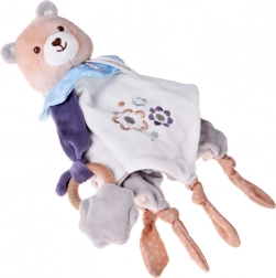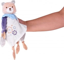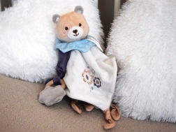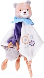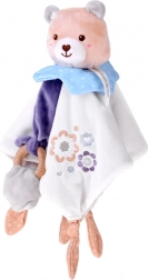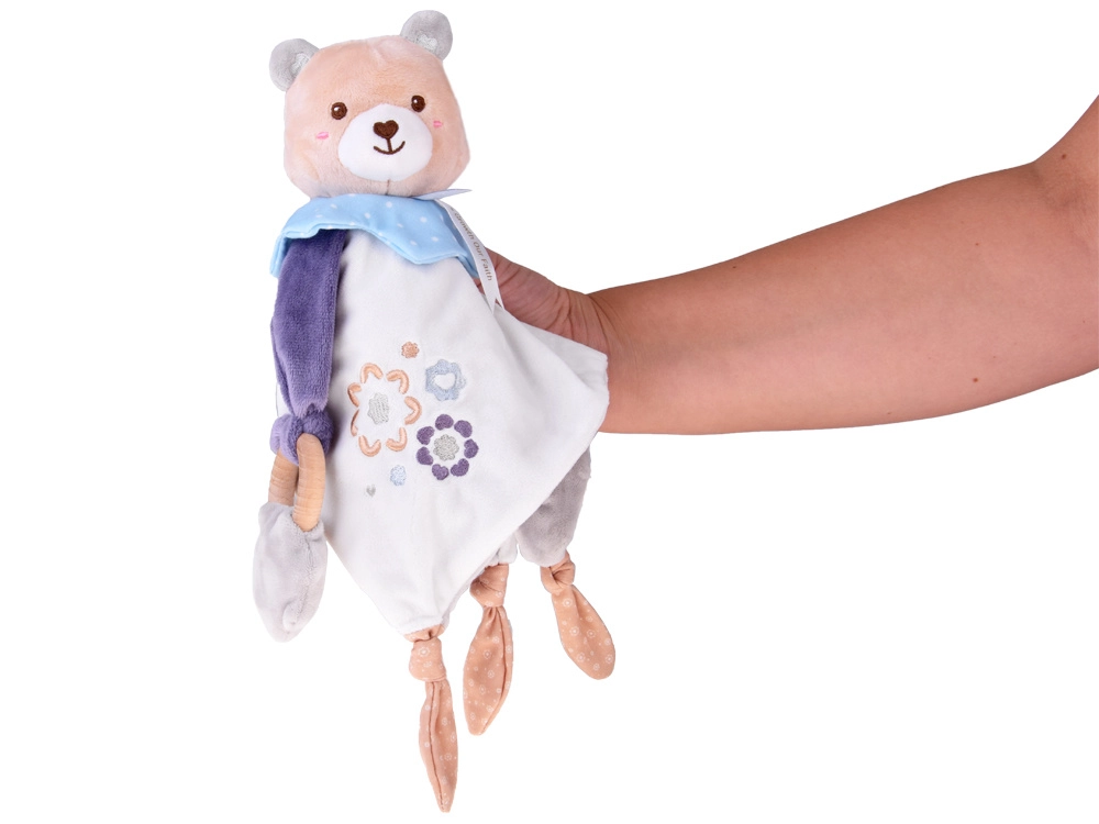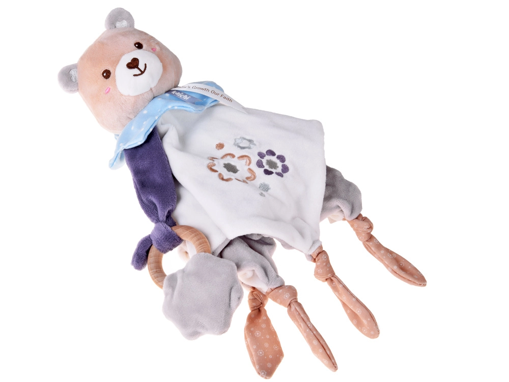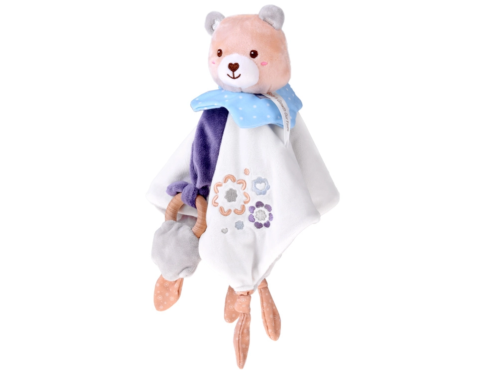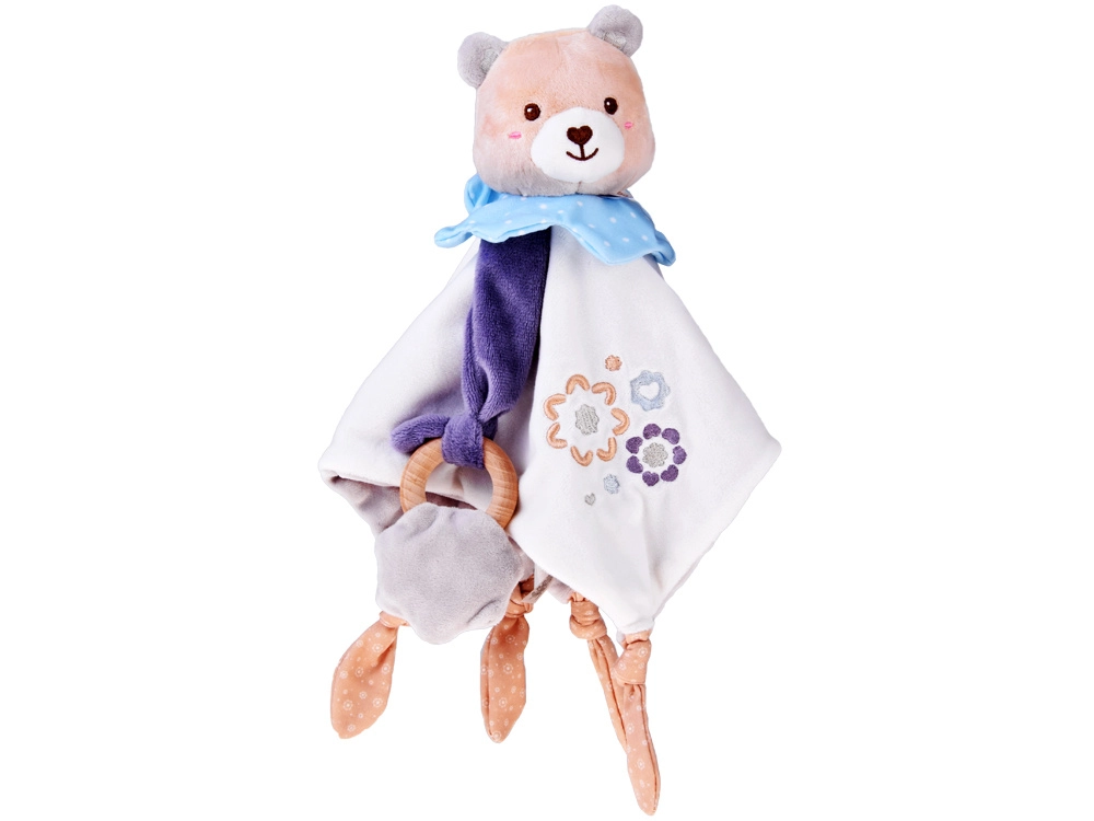 Urocza przytulanka dla niemowląt łączy w jednym pluszowego misia, miękki uspokajający kocyk oraz drewniany gryzak. Oferuje różnorodne faktury, haftowane detale i supełki ułatwiające chwytanie, które wspierają rozwój sensomotoryczny i dają poczucie bezpieczeństwa od pierwszych dni życia.