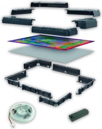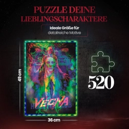 W opakowaniu znajdziesz wszystko, czego potrzebujesz do złożenia i wyeksponowania gotowego dzieła: puzzle 520 elementów, twardy karton jako podkład, klej, montażową plastikową ramę, moduł elektroniczny oraz taśmę RGB LED, a także plakat referencyjny i instrukcję. Po złożeniu obraz ma wymiary ok. 36 × 49 cm i świetnie sprawdzi się jako dekoracja z efektem nakładania trzech poziomów kolorów.