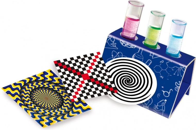 Zestaw zawiera karty ze złudzeniami optycznymi oraz proste eksperymenty, które pokazują dzieciom, jak ludzkie oko postrzega światło, kolory i wzory.