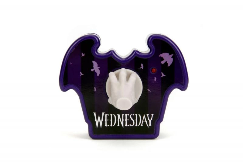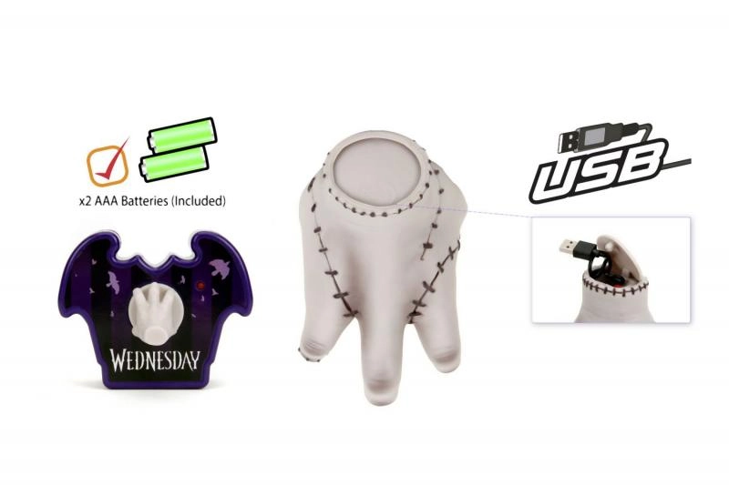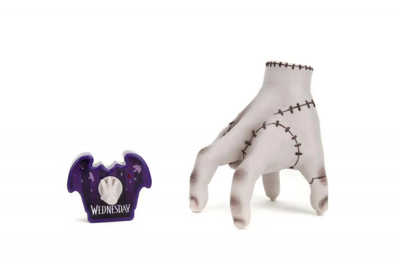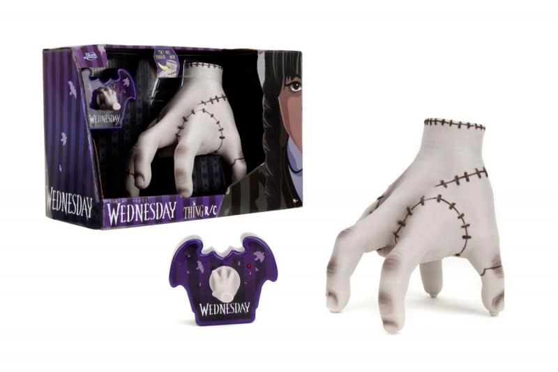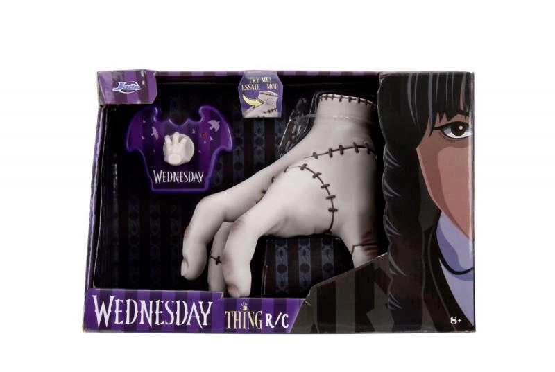 Odkryj kultową postać Thing z serialu WEDNESDAY jako zabawną zdalnie sterowaną figurkę o wysokości 16 cm od marki Jada Toys. W zestawie stylowy fioletowy pilot w kształcie nietoperza z małą rączką jako joystickiem. Wystarczy włożyć baterie, wcisnąć górną część zabawki, a dłoń zacznie się poruszać – idealny prezent dla dzieci i dorosłych fanów.