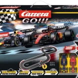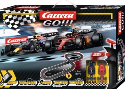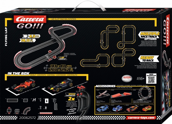 Wejdź do świata prędkości z torem Carrera GO!!! Flying Lap. Po złożeniu ma wymiary 183 × 80 cm, a sprytnie zaprojektowany układ z mostkiem zapewnia dynamiczne wyścigi dwóch ikon Formuły 1 – FERRARI SF-23 „C. Sainz” i RED BULL RACING RB19 „M. Verstappen”. Analogowy system z mechanicznym licznikiem okrążeń i kontrolerami z funkcją Turbo dostarcza emocjonujących pojedynków koło w koło.